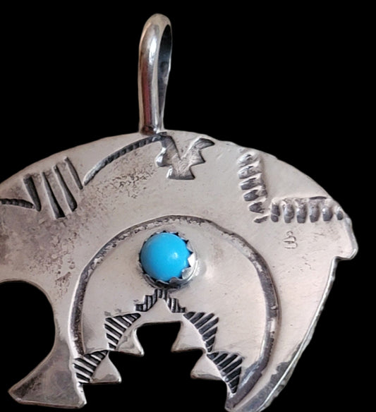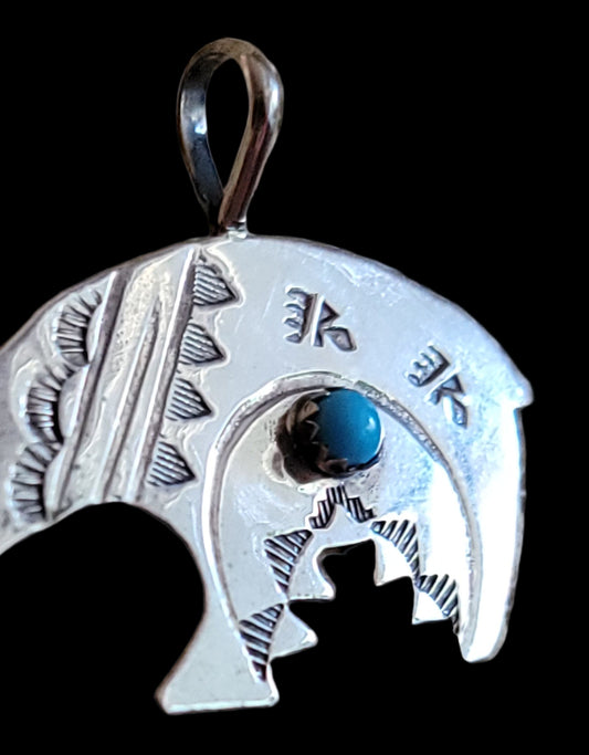 Navajo Sterling Silver Fetish Bear Pendant w/ Stampwork and Turquoise Stone Indian Jewelry