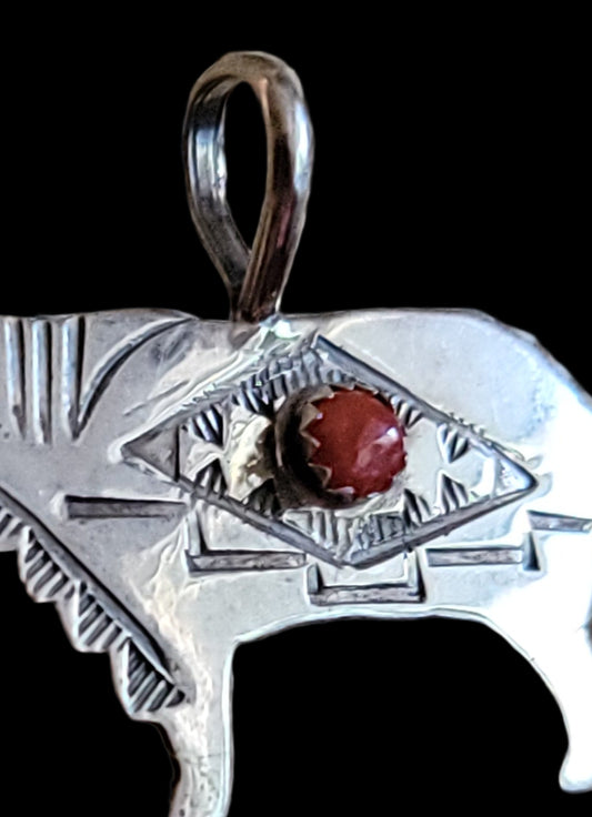 Sterling Silver Navajo Wolf Pendant w/Coral Stone Indian Jewelry