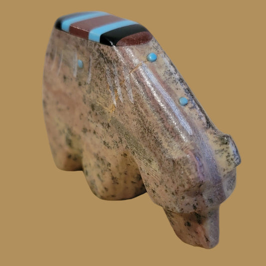 Serpentine Grizzly Bear w/ Inlaid Back Zuni Fetish