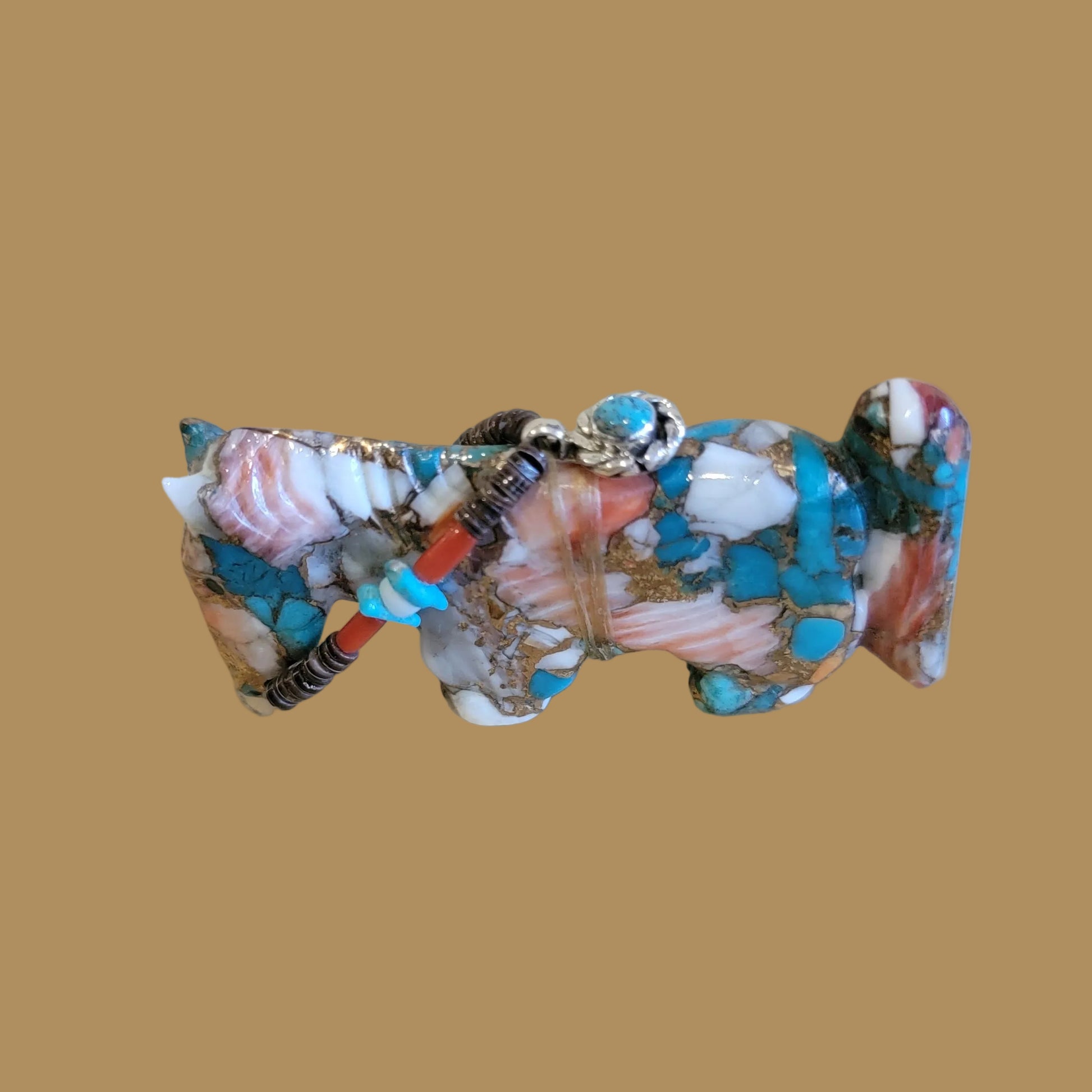 Medium: Soiny Oyster shell/ Turquoise/ Pyrite Composite with jet eyes/ Beautiful deep red coral heishe with turquoise nuggets and olive shell heishe bridle / sterling silver and turquoise pendant attached.