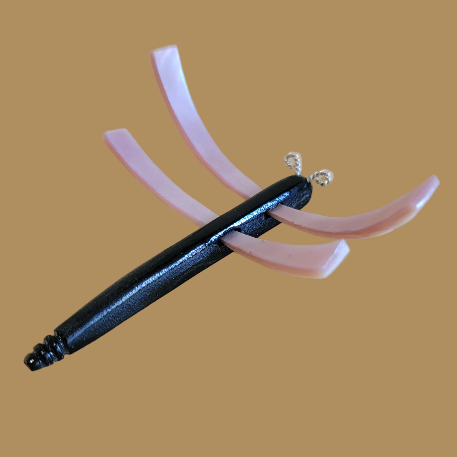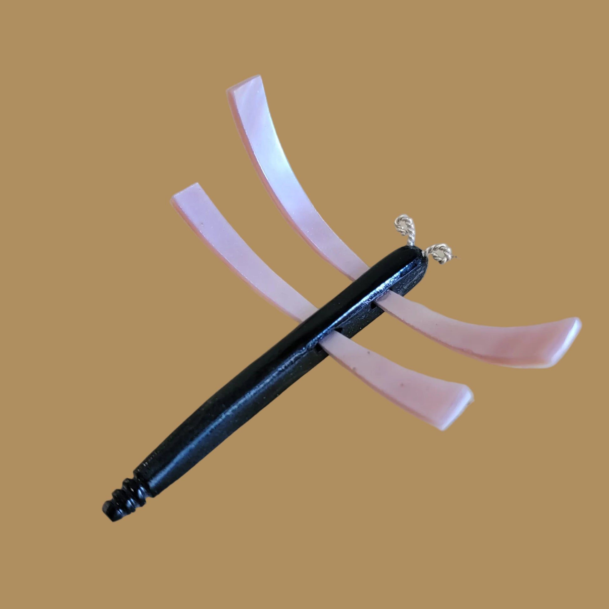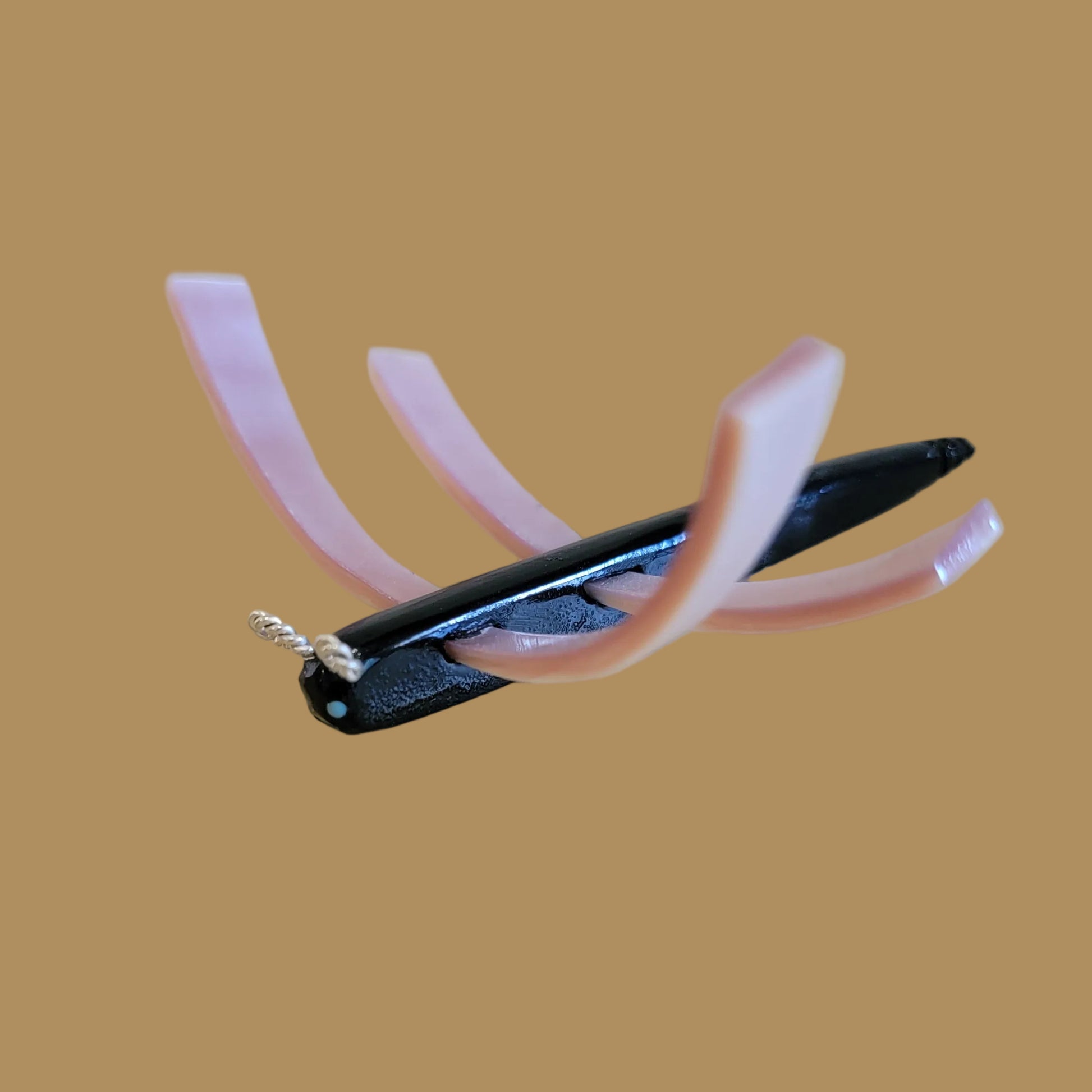 Medium: Jet body with turquoise eyes/ pink mussel shell wings/ sterling silver antennae