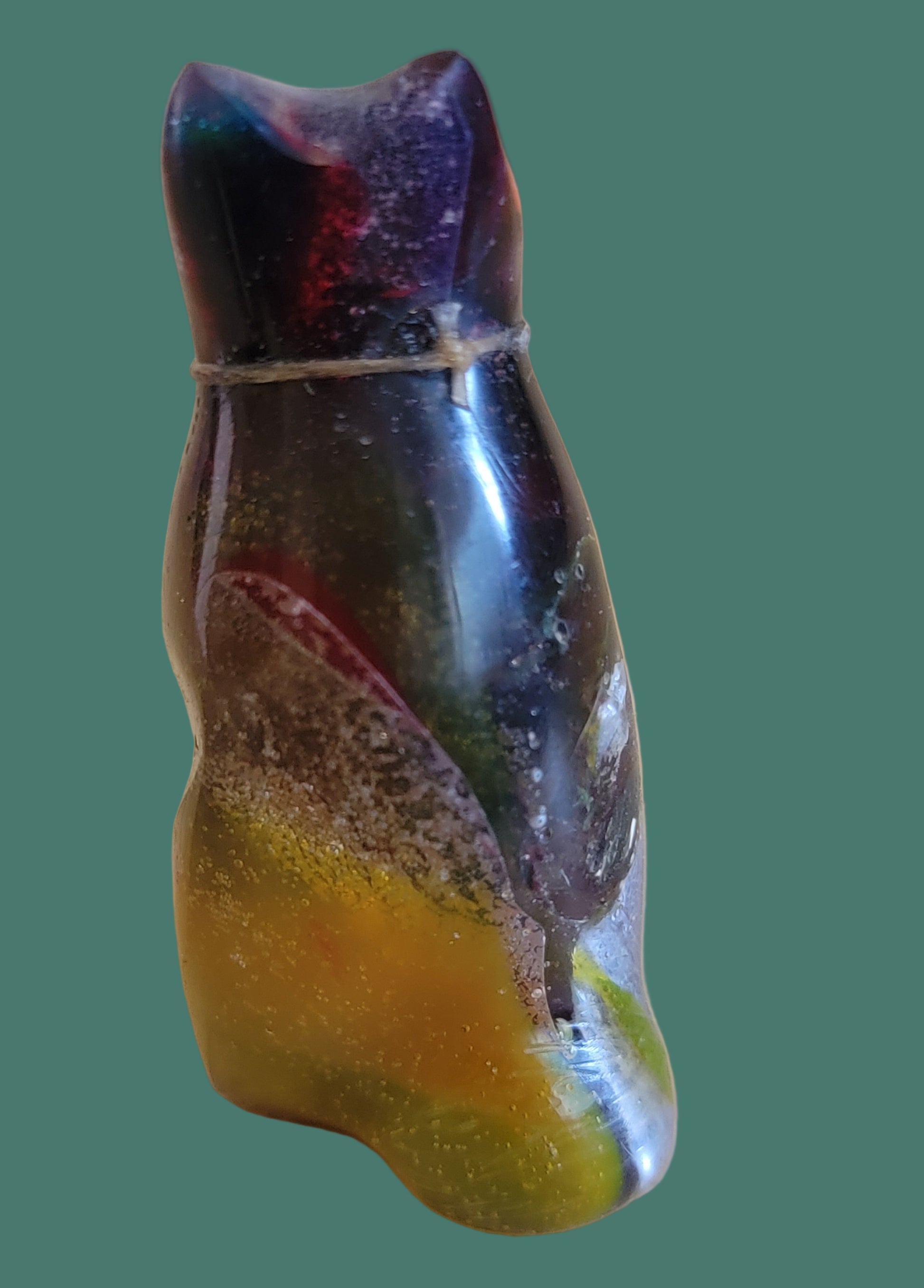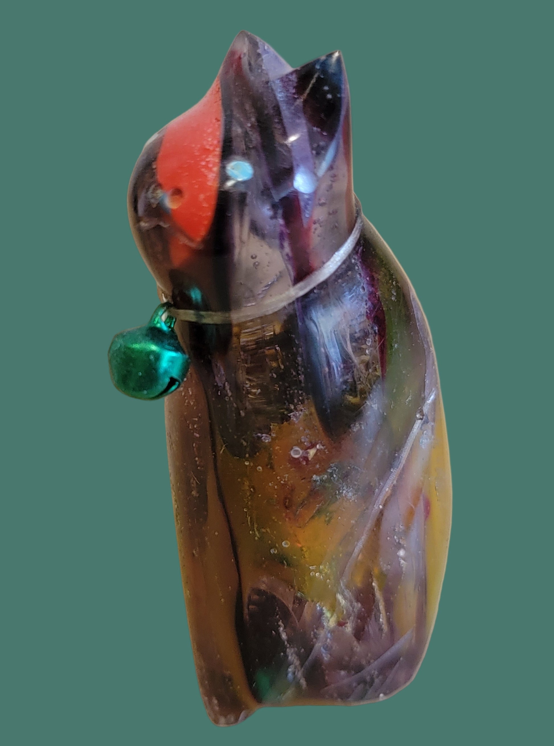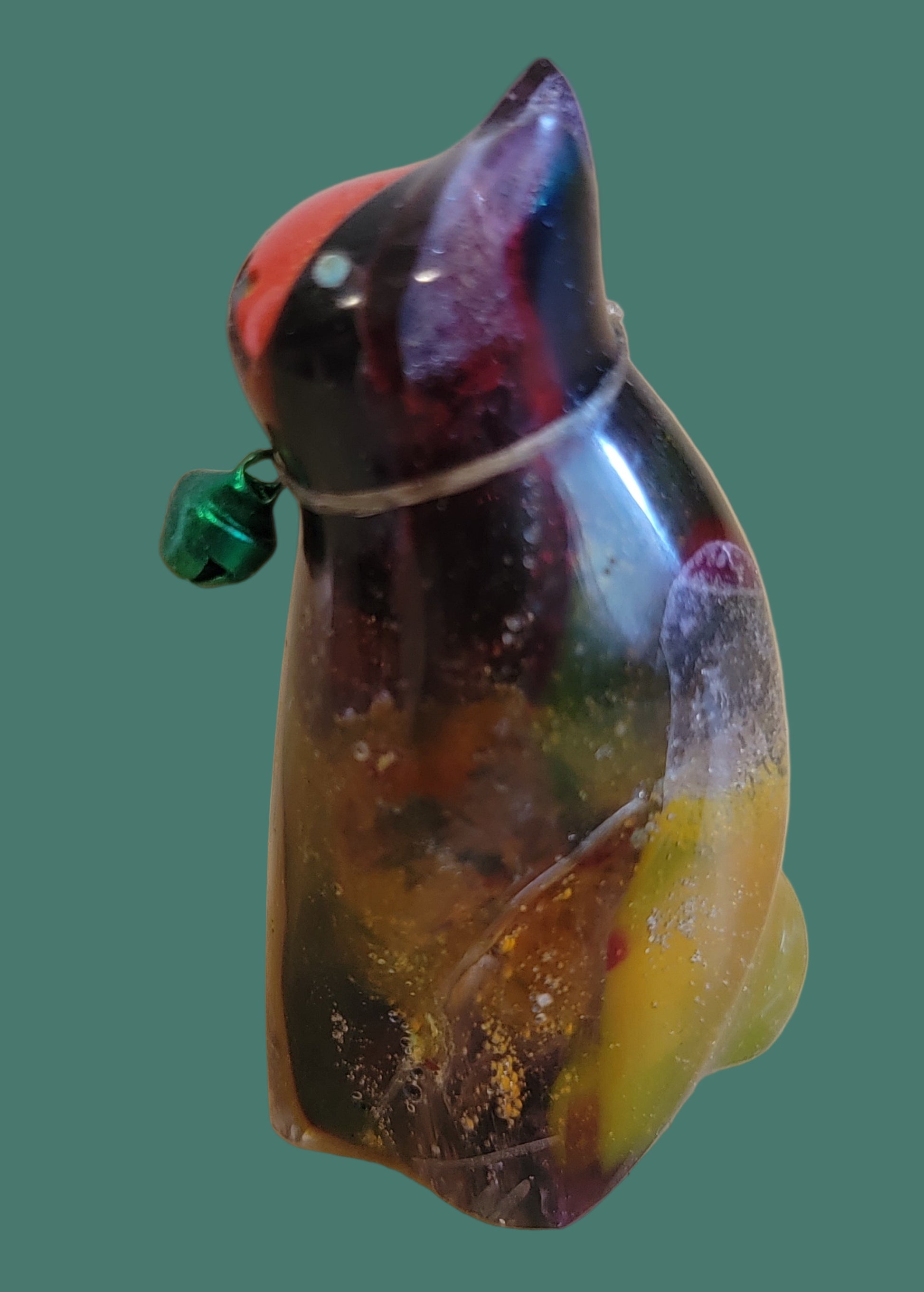 Medium: colorful Surfite with turquoise eyes/ mini green jingle bell with sinew collar