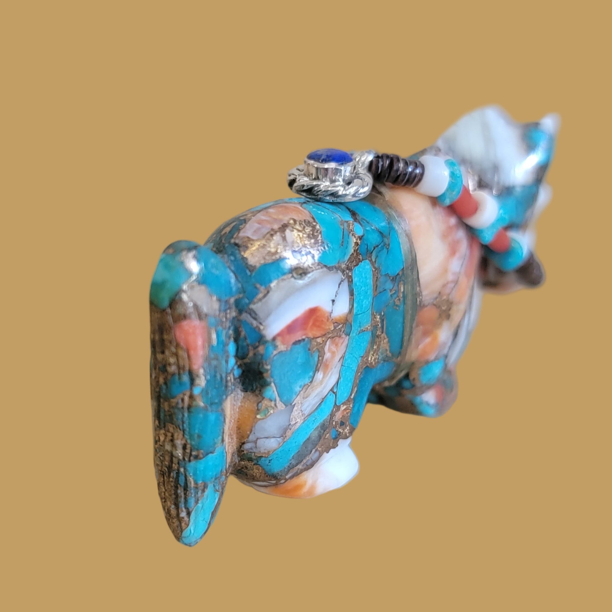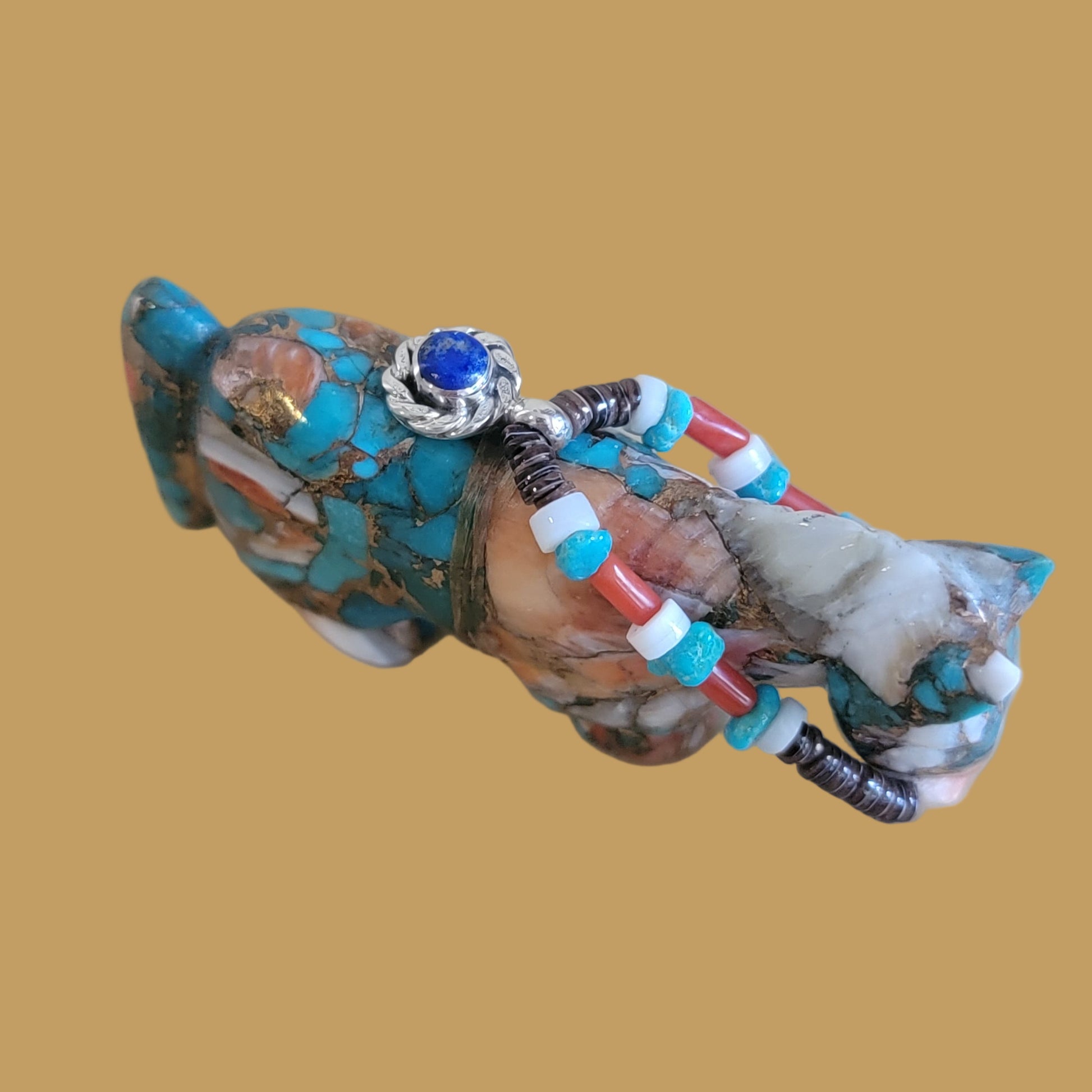 Medium: Colorful turquoise, spiny oyster shell and pyrite Composite with jet eyes/ olive and clam shell heishe with beautiful coral heishe and turquoise nuggets bridle / sterling silver and lapis pendant attached.