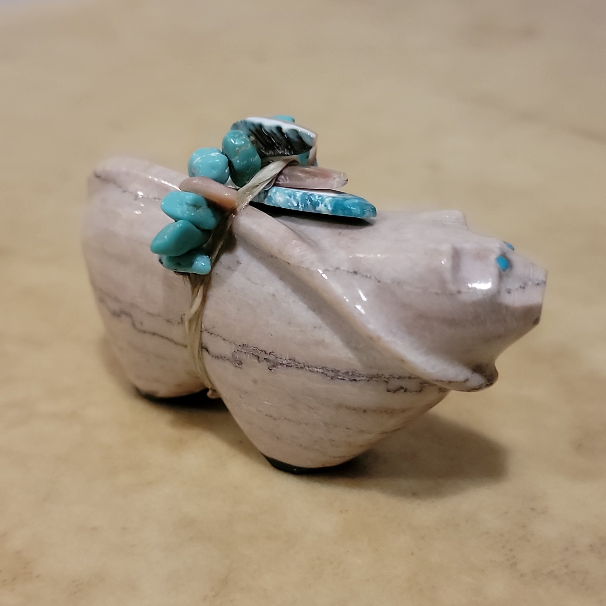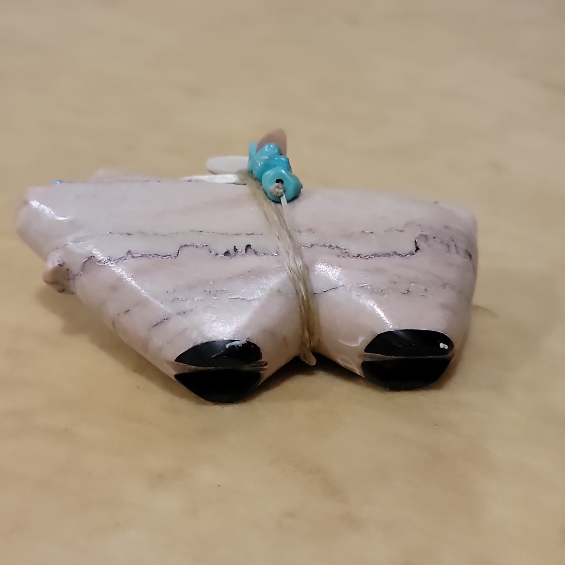 Medium: Dolomite with turquoise eyes/ Turquoise arrowhead with shell and turquoise nuggets and green snail shell wrap offering/ Jet feet