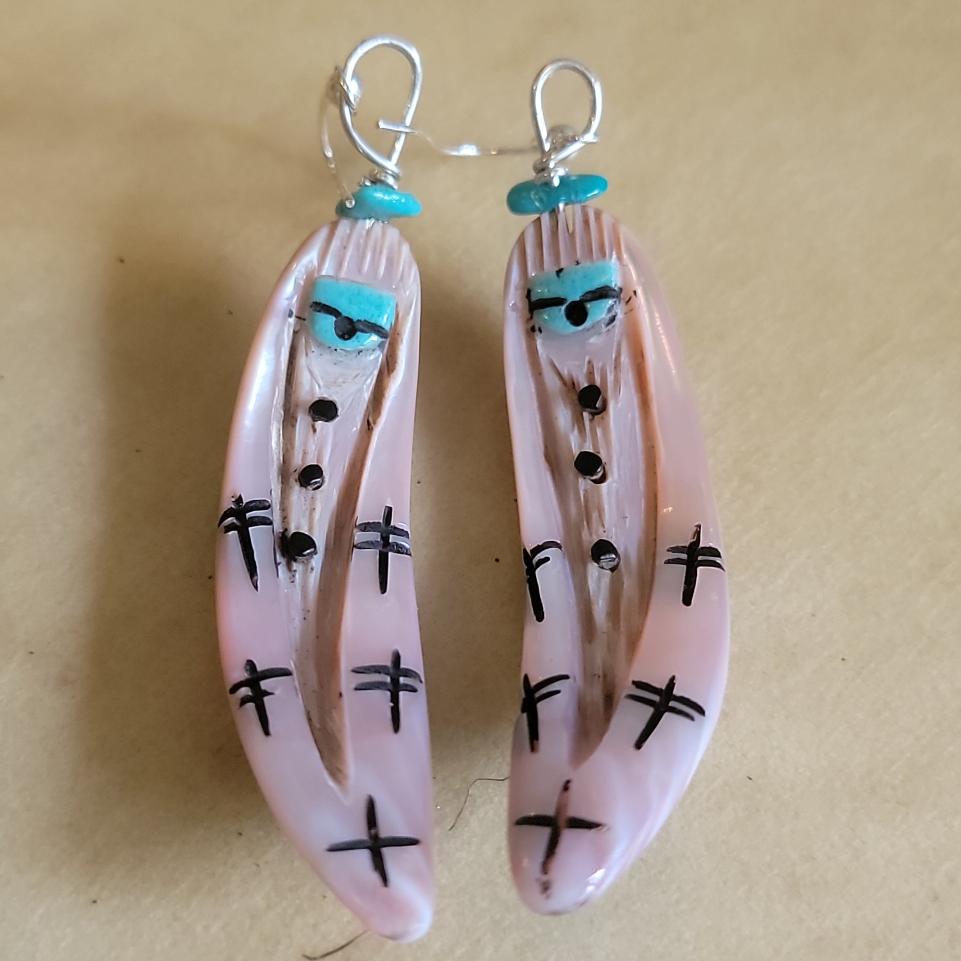 Medium: Pink Mussel Shell Maidens with turquoise faces/ jet eyes, mouth , appointments and dragonflies with mosaic inlay on opposite sides, turquoise slab at top of each maiden/ Jet/ Lapis /Gold Lip/ Turquoise/ Abalone shell/ Malachite/ Mother of Pearl/ Orange and Red Spiny Oyster shell and MORE! Sterling Silver French wires/ for pierced ears only.