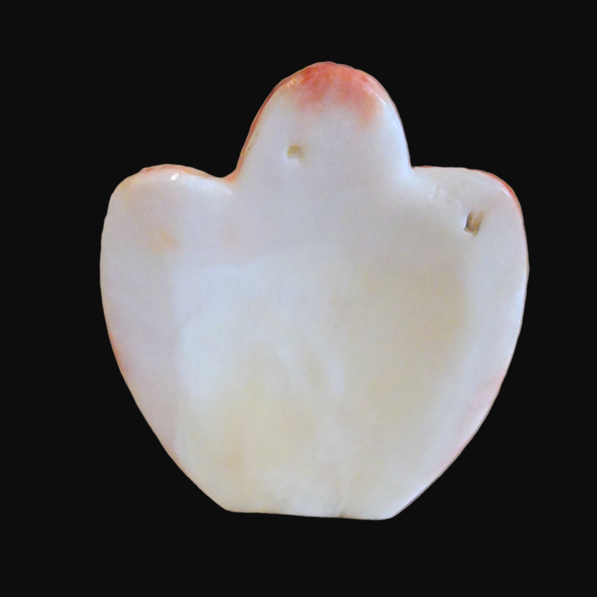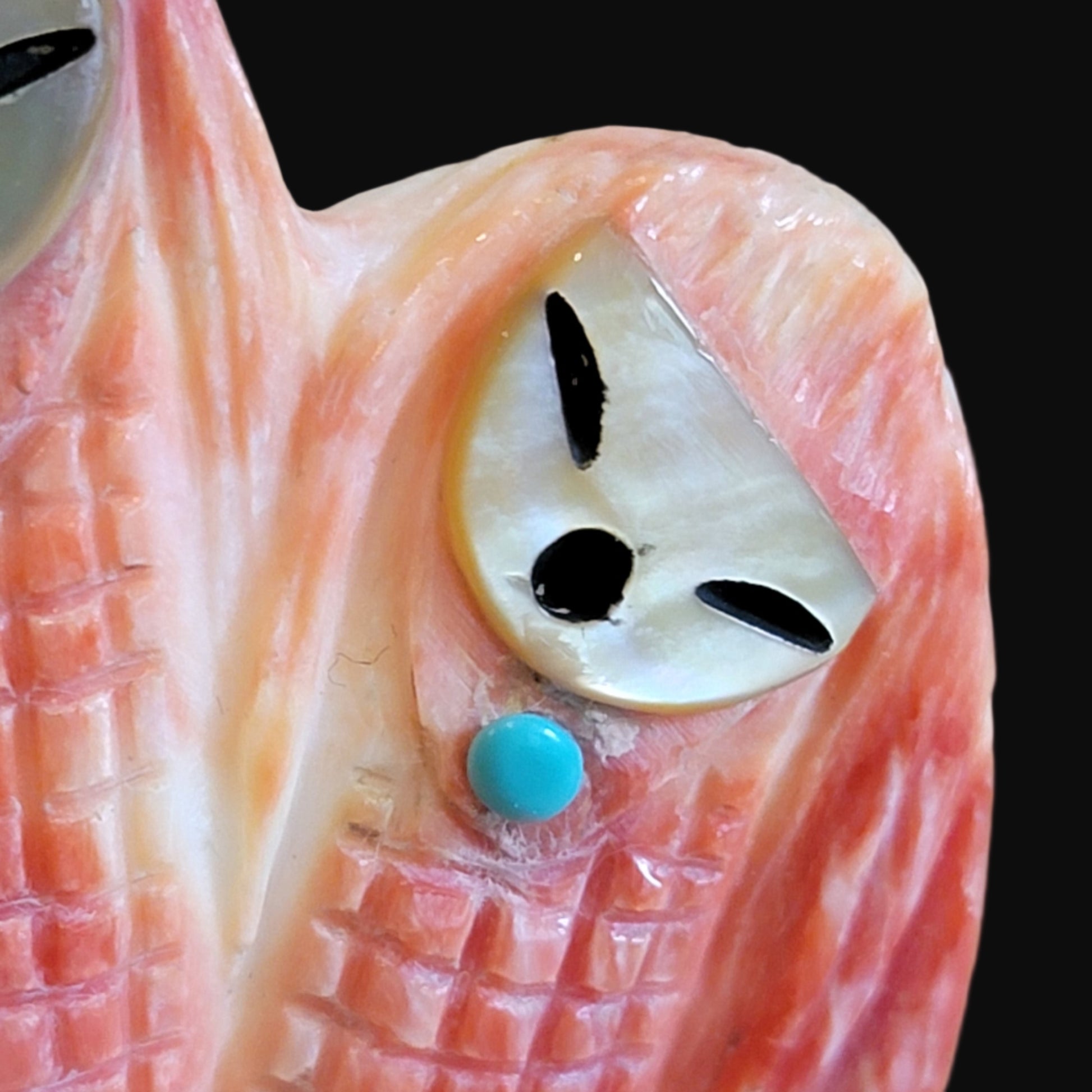 Medium: Spiny oyster shell with Mother of Pearl face and jet eyes and mouths/ Turquoise appointments at neck of each/ Jet stars and dragonflies on shawl
