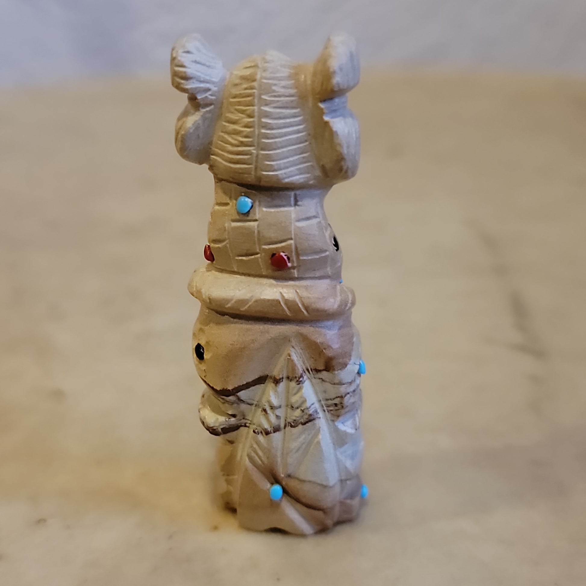 Medium: Picture Stone Jasper with turquoise eyes and jet mouth/ multi jet, turquoise and coral appointments set in designs on shawl with carved feather pattern at back/ Turquoise, coral and jet Zuni Sun pattern center front!