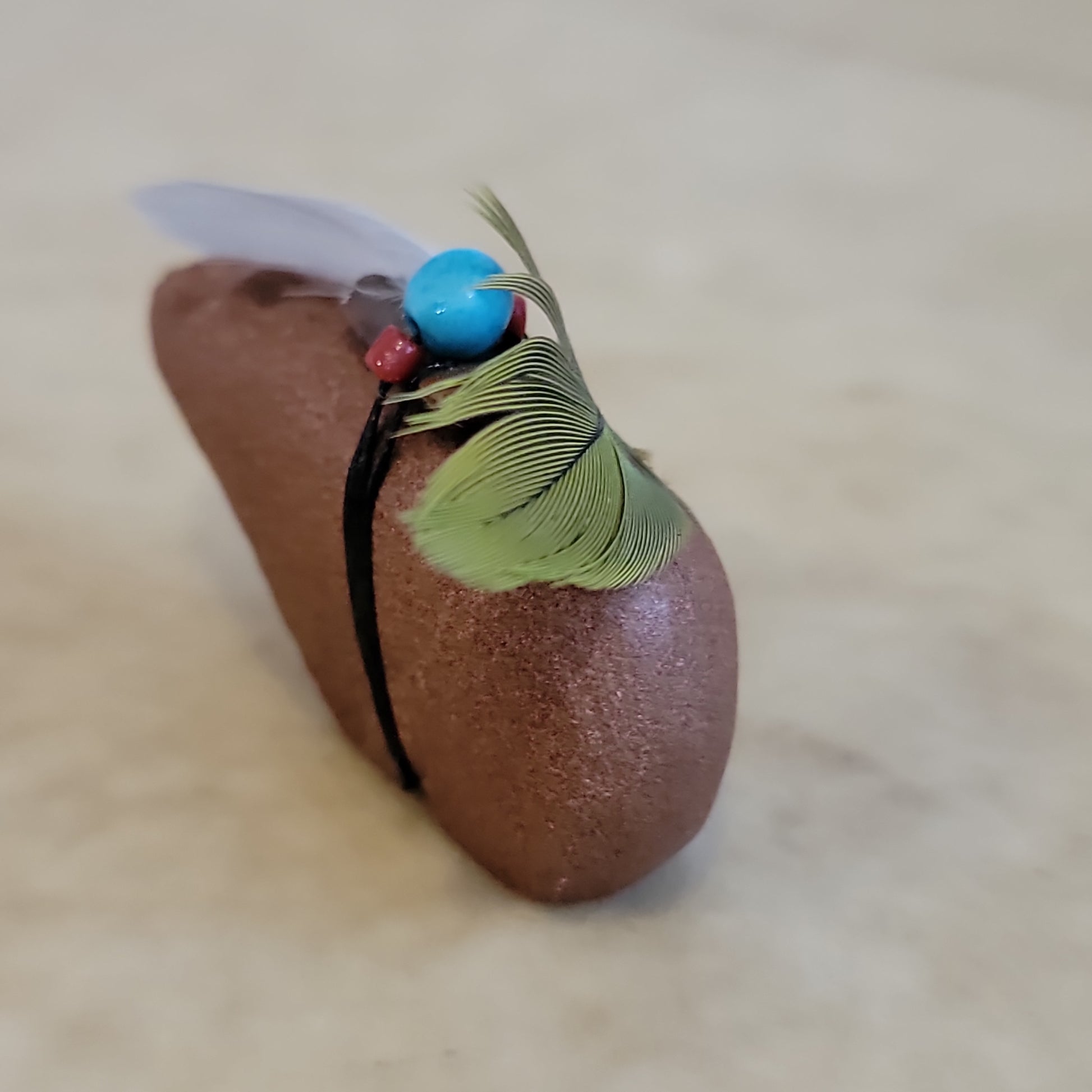 Medium: Sandstone with jet eyes and hallmark/ coral heishe, turquoise nugget and natural feathers