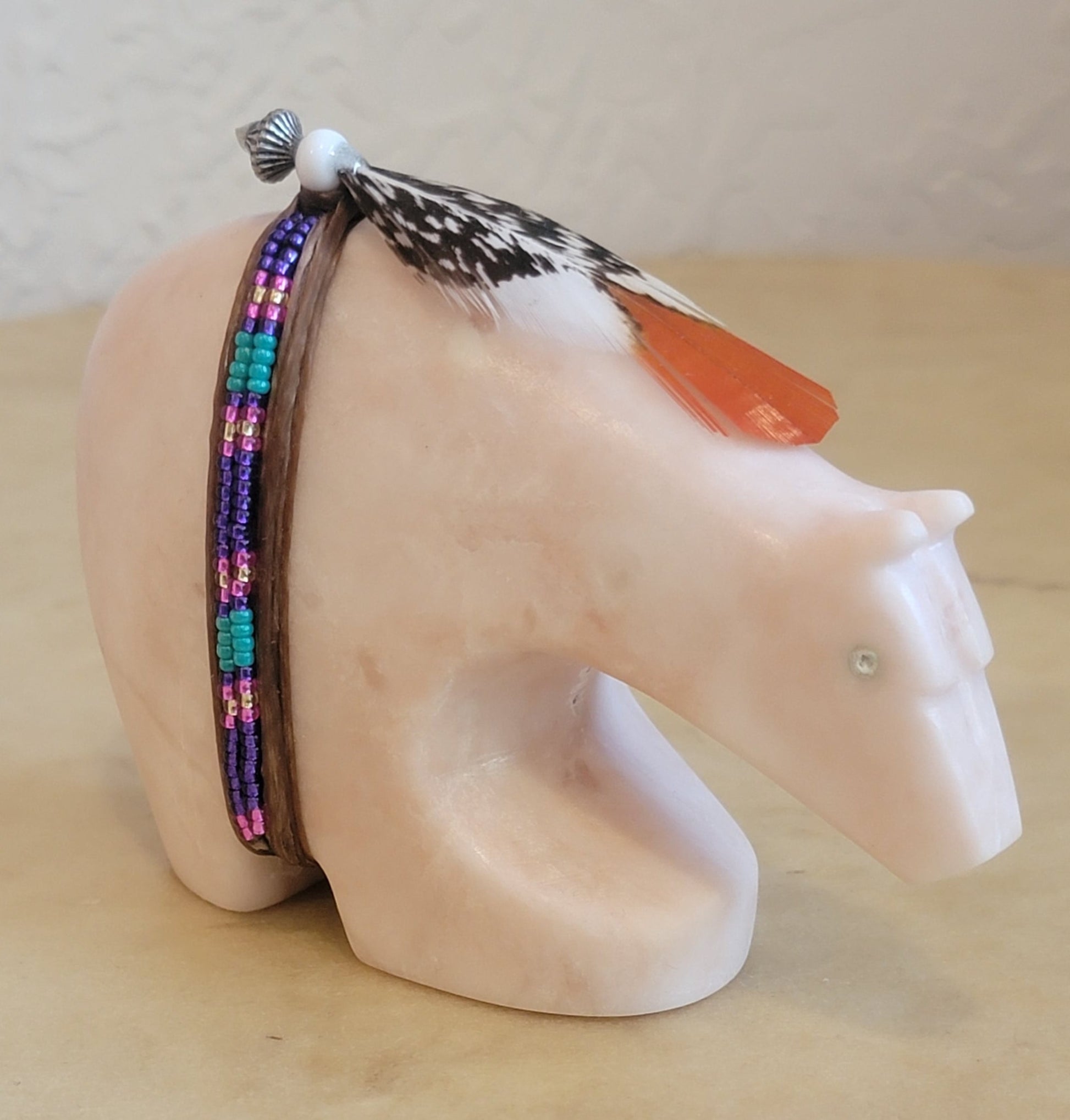 Medium: Alabaster with turquoise eyes/ beautiful glass seed beads and pony bead with melon bead and colorful feather sinew wrapped offering