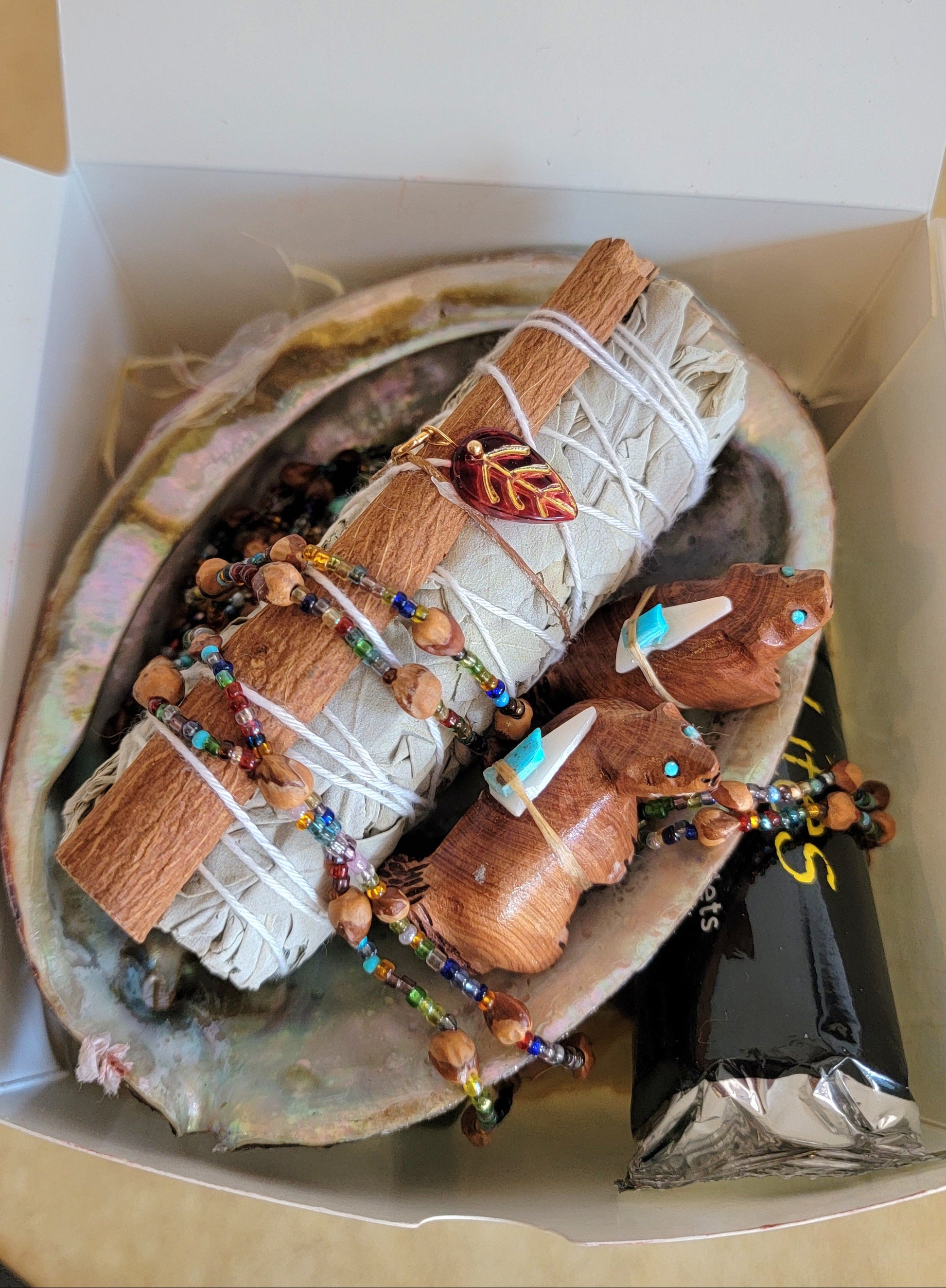 This kit includes one sage smudge stick adorned with cinnamon stick and leaf talisman.