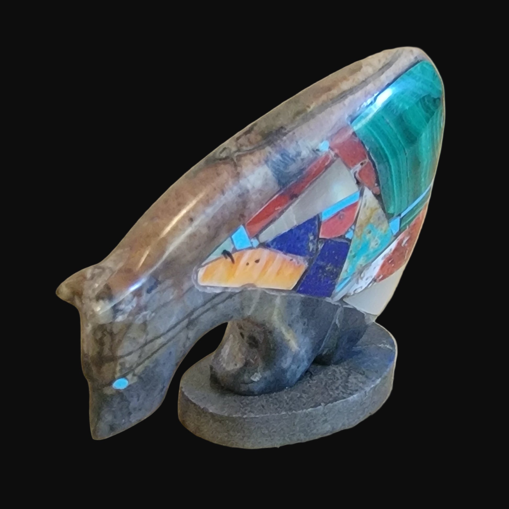 Medium: Picasso Marble Bear with Maiden on one side with Spiny Oyster shell face with jet eyes and mouth/ Turquoise appointment/ Jet dragonflies on bear~shawl/ Turquoise eyes on Bear/ Opposite side has mosaic inlay with lapis /several shades of spiny oyster shell/various shades and sizes of turquoise along with black marble , Mother of Pearl and Malachite/ Stones and shells form a beautiful and colorful pattern! / Jet base