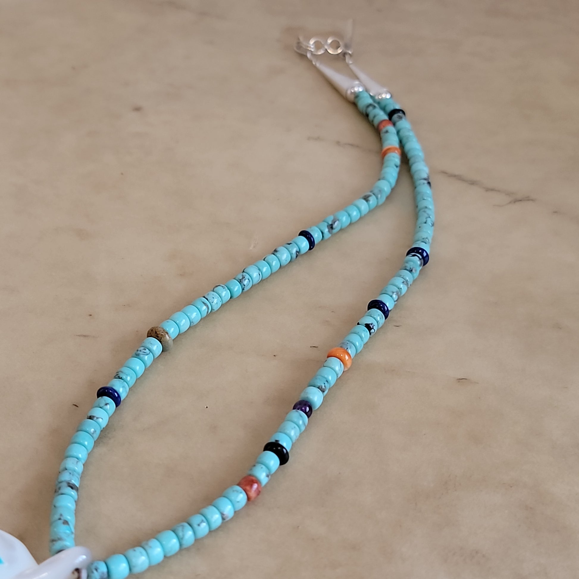 Medium: Mother of pearl with gold lip/ Turquoise eyes and double sided heartline/ 20 inch Turquoise beads with multiple stone accents necklace and sterling clasp.