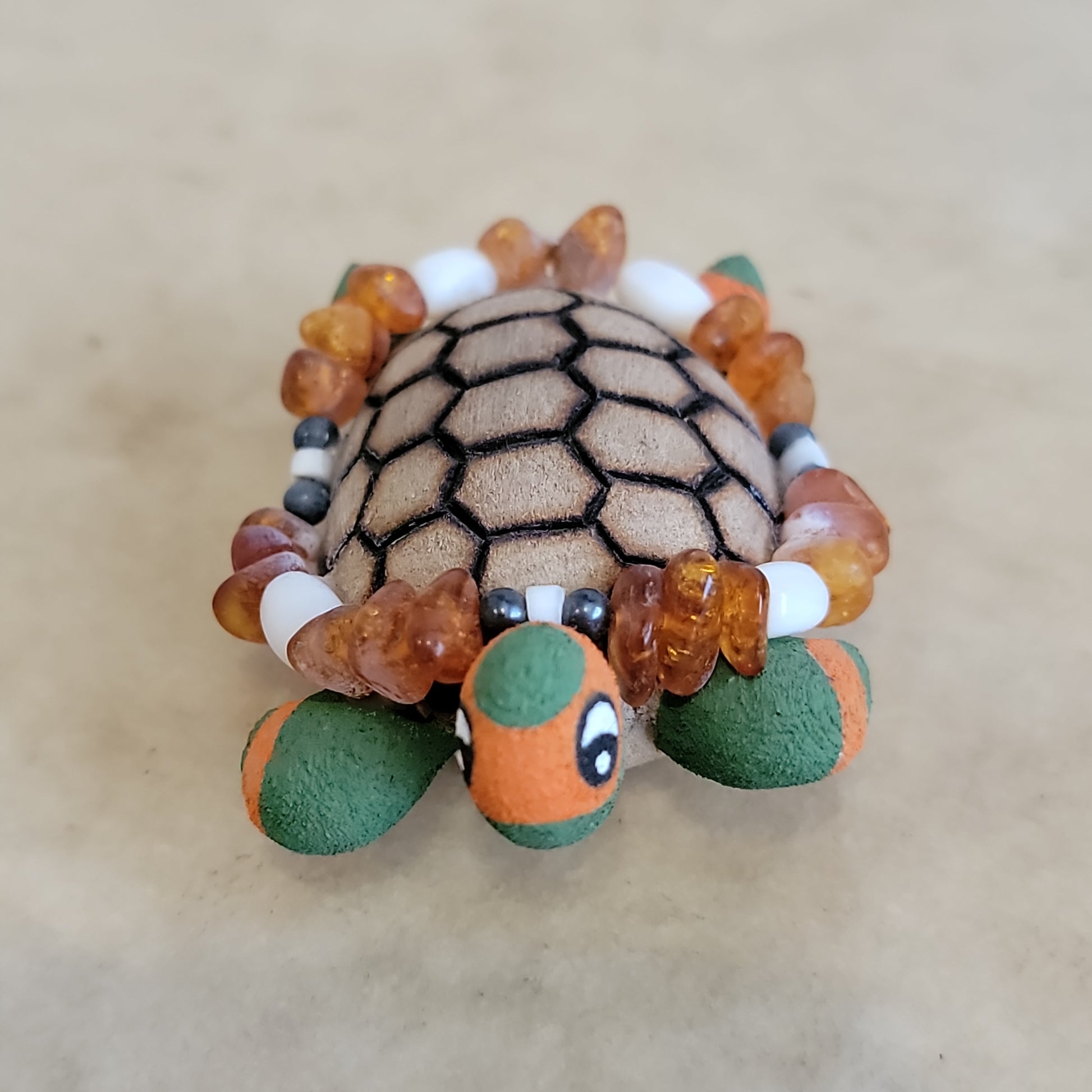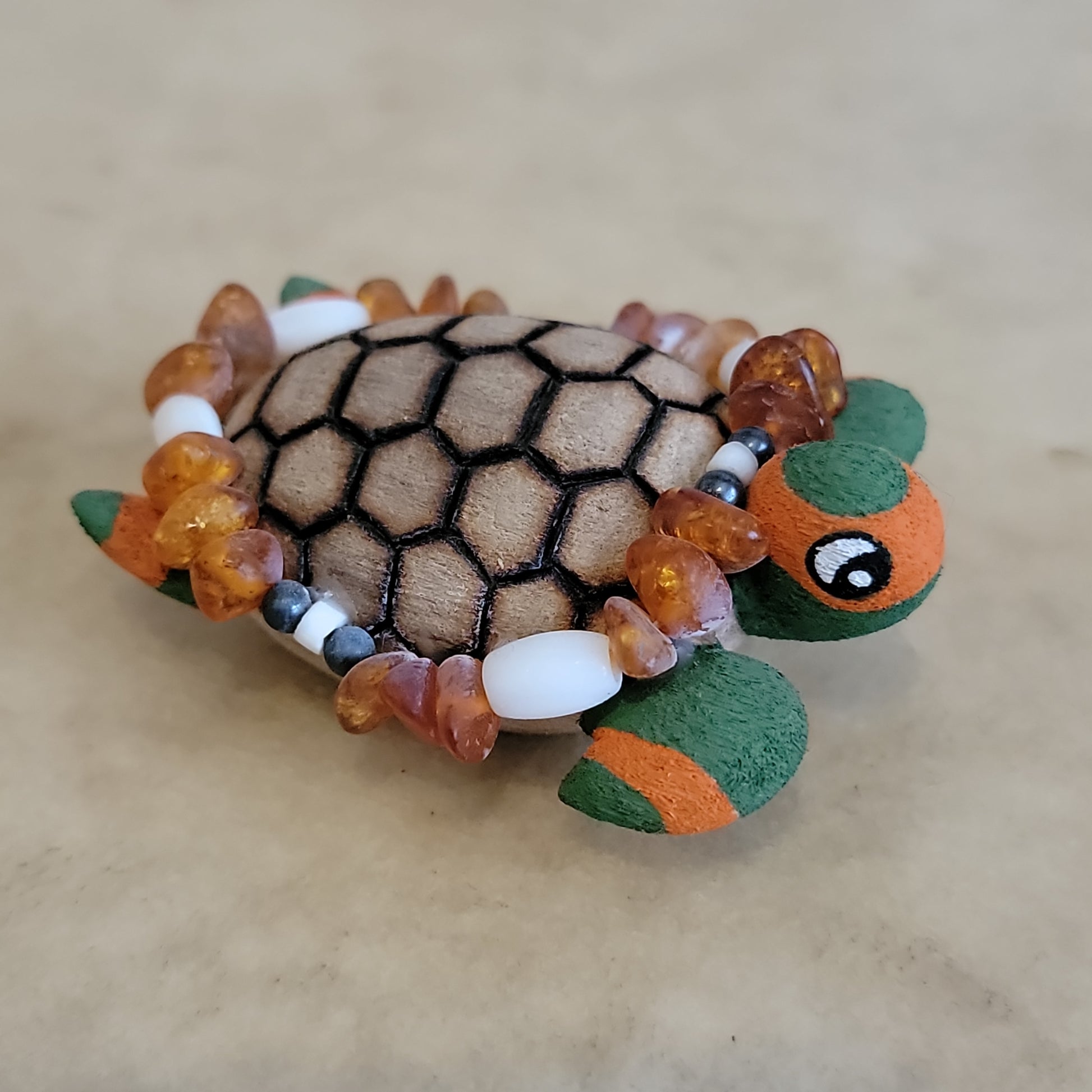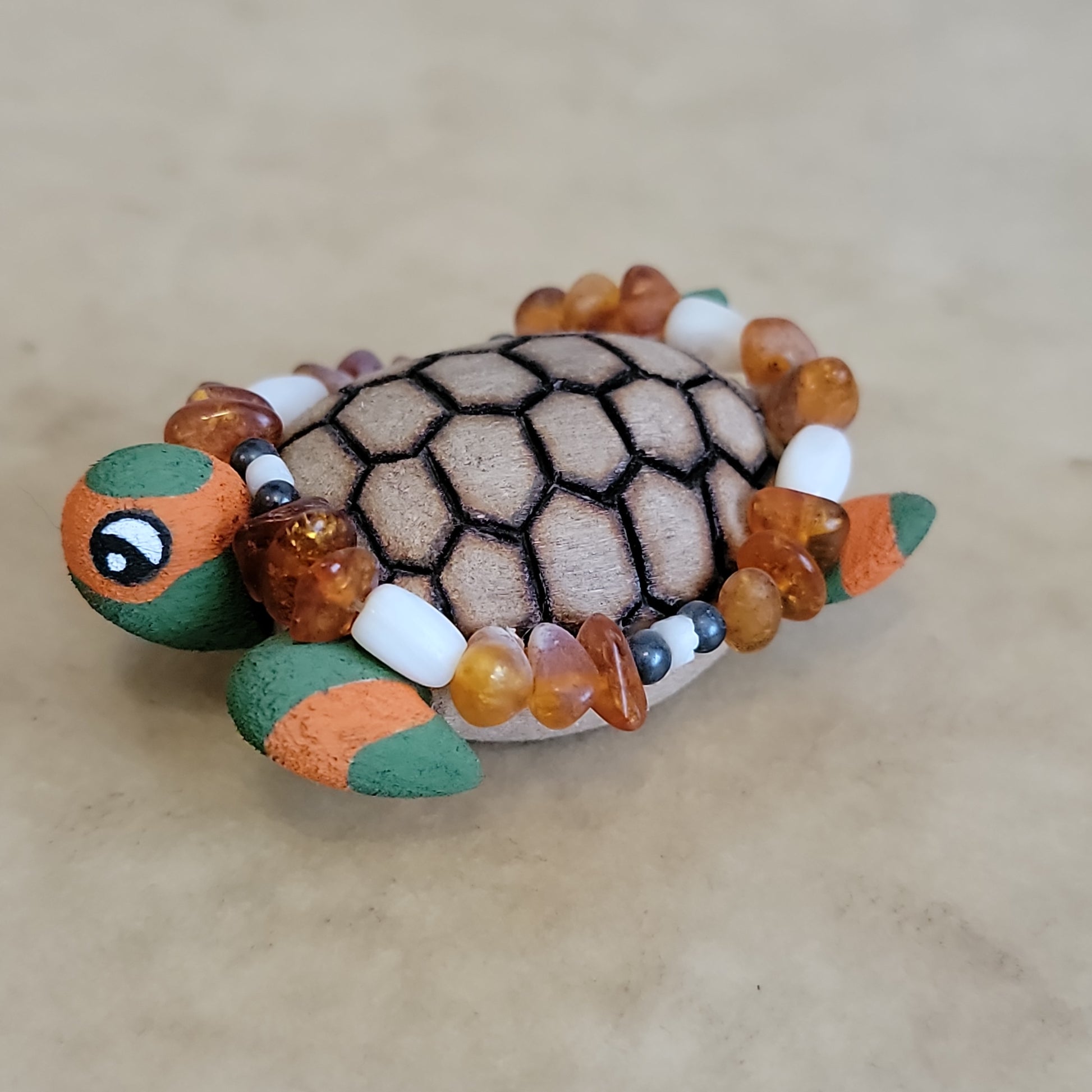 Medium: Cottonwood root / wood burned shell body/ Hand painted head, eyes and legs/ Fancy because of offering of Amber Nuggets Fresh Water Pearls, and Hair Pipe beads