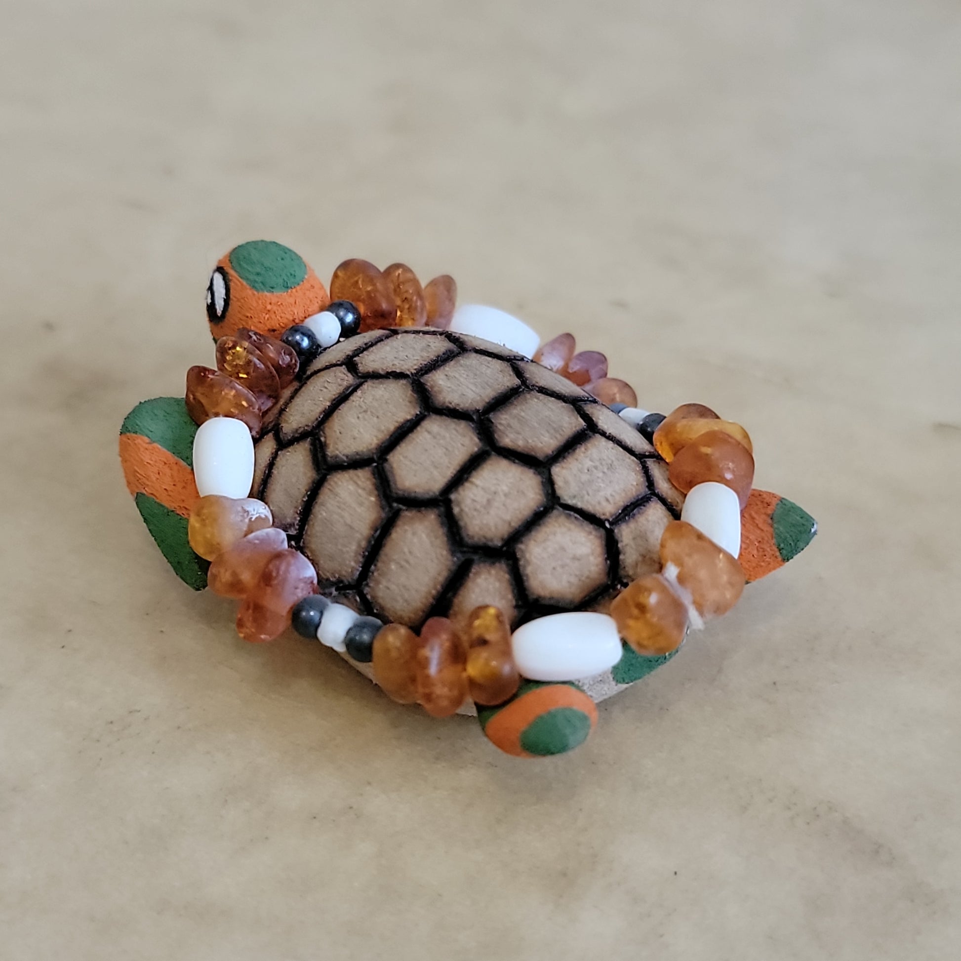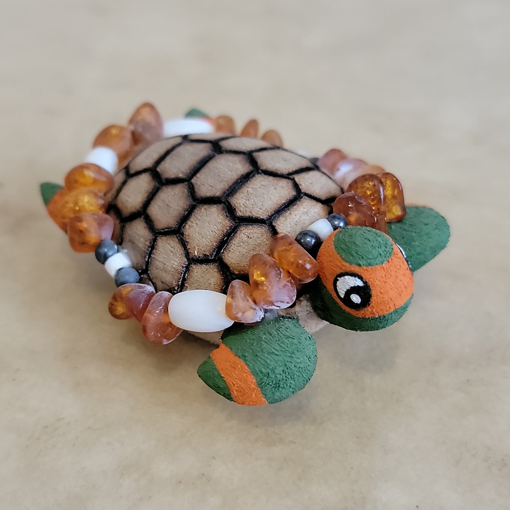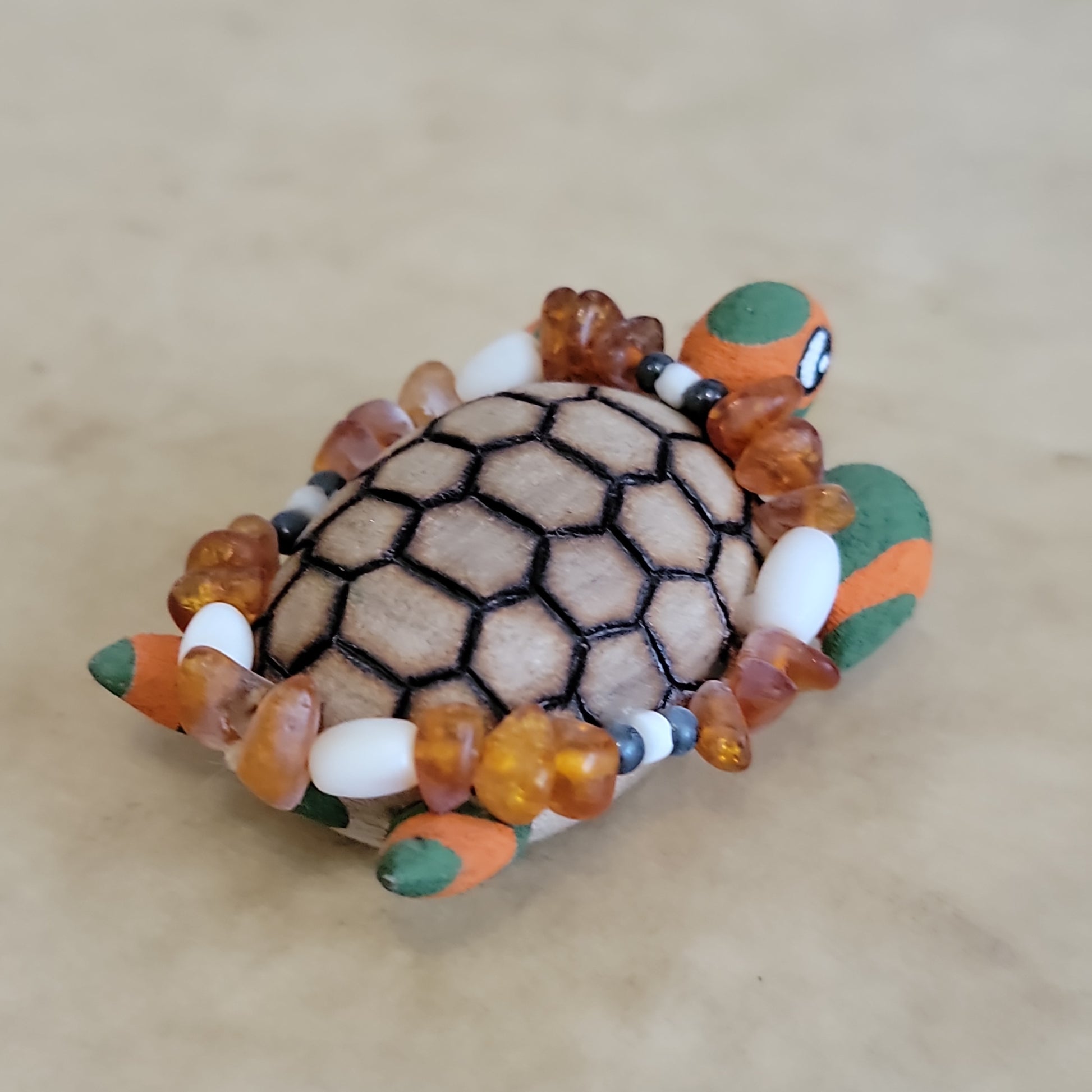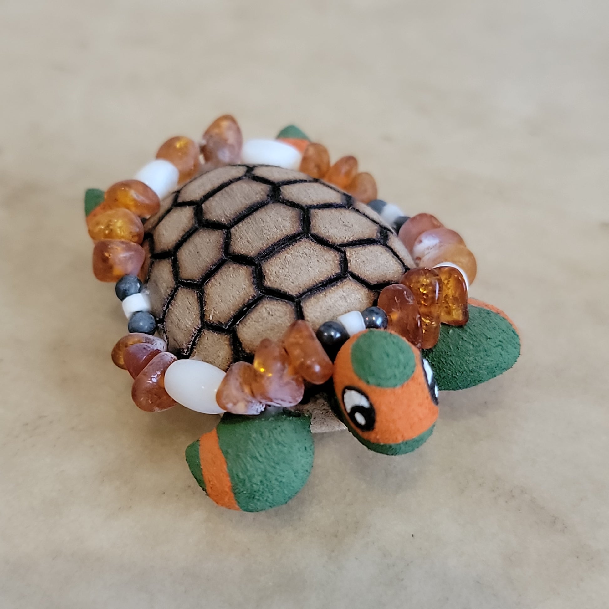 Medium: Cottonwood root / wood burned shell body/ Hand painted head, eyes and legs/ Fancy because of offering of Amber Nuggets Fresh Water Pearls, and Hair Pipe beads