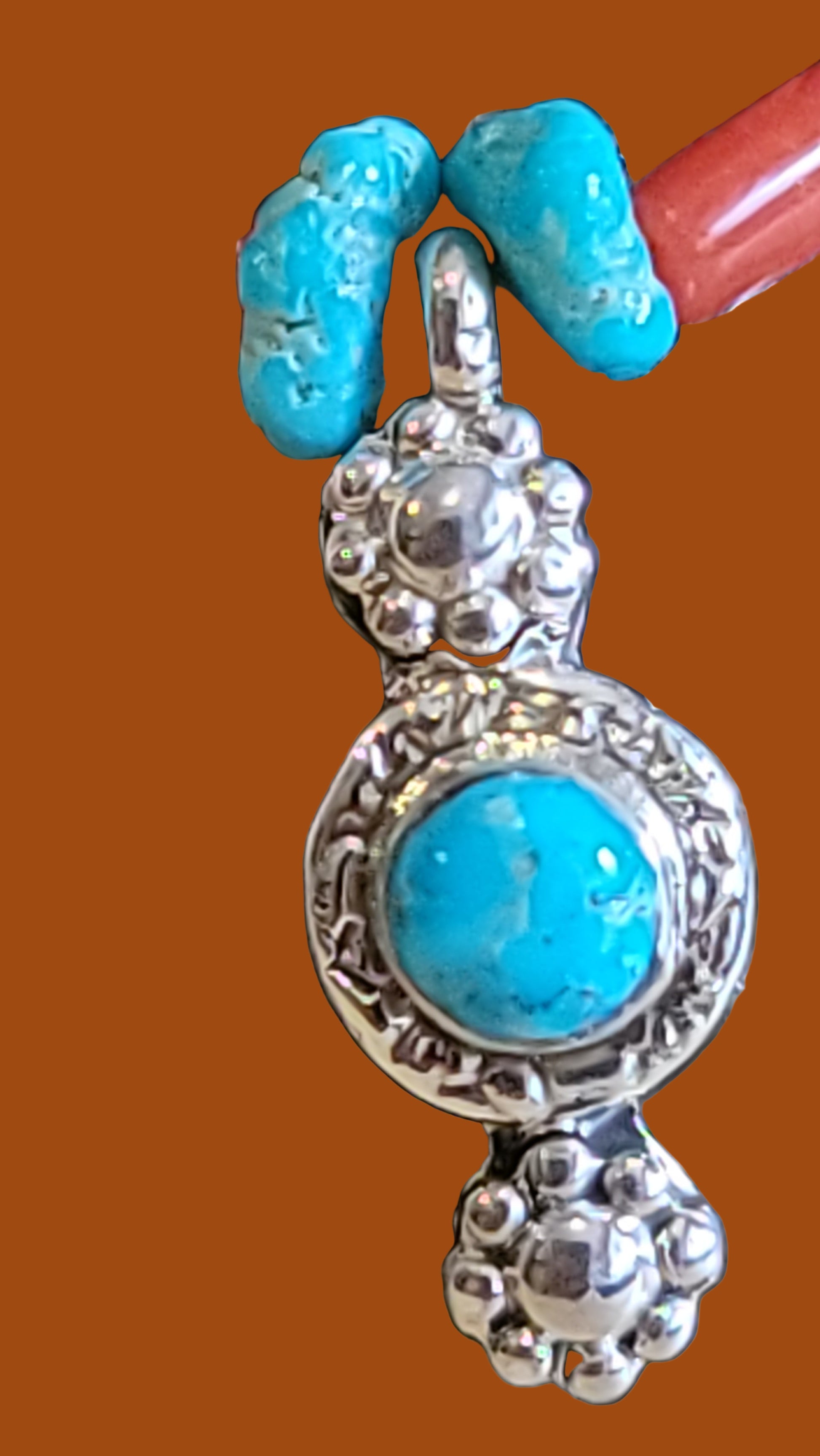 Medium: Fluorite with gold lip and jet eyes/ shell heishe with turquoise slabs and sterling silver with turquoise center stone necklace!
