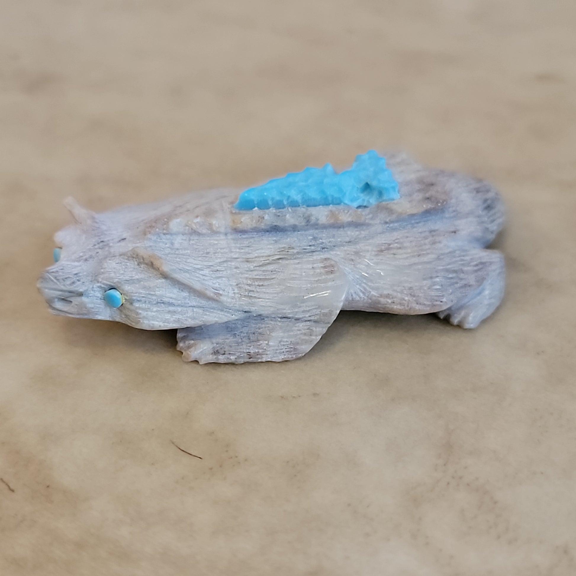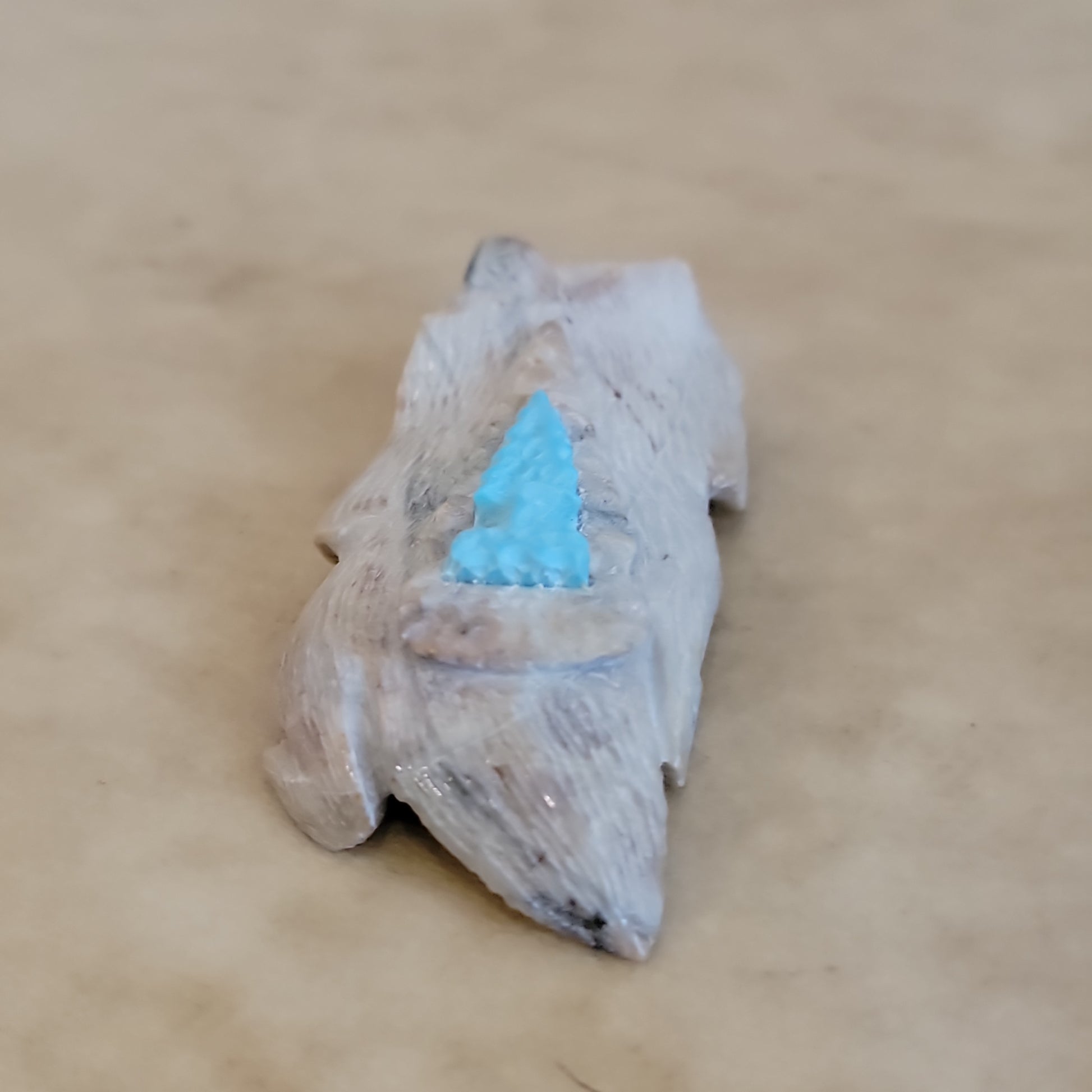 Medium: Etched Picasso Marble with turquoise eyes and delicately carved turquoise arrowhead on top of arrowhead carved directly onto badger