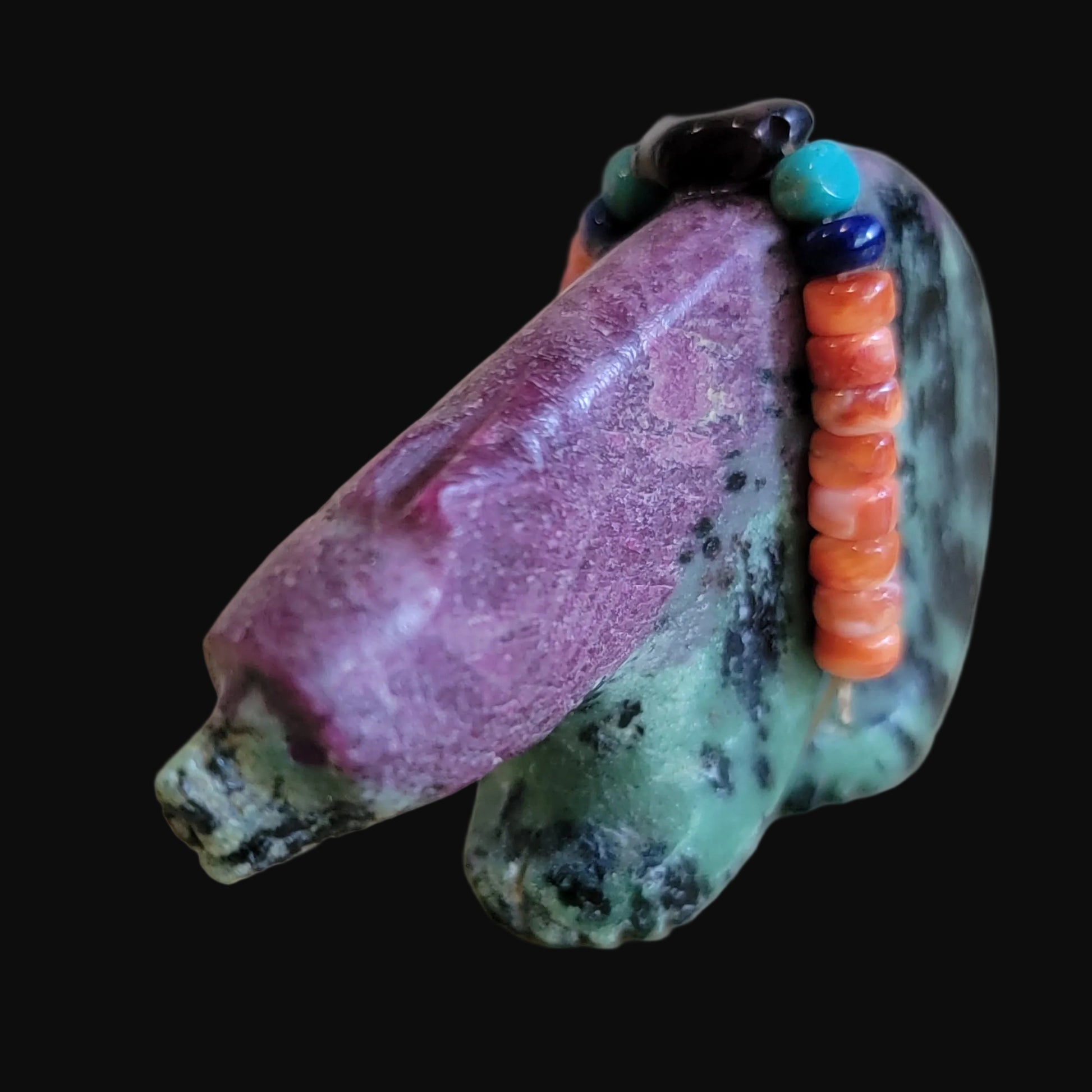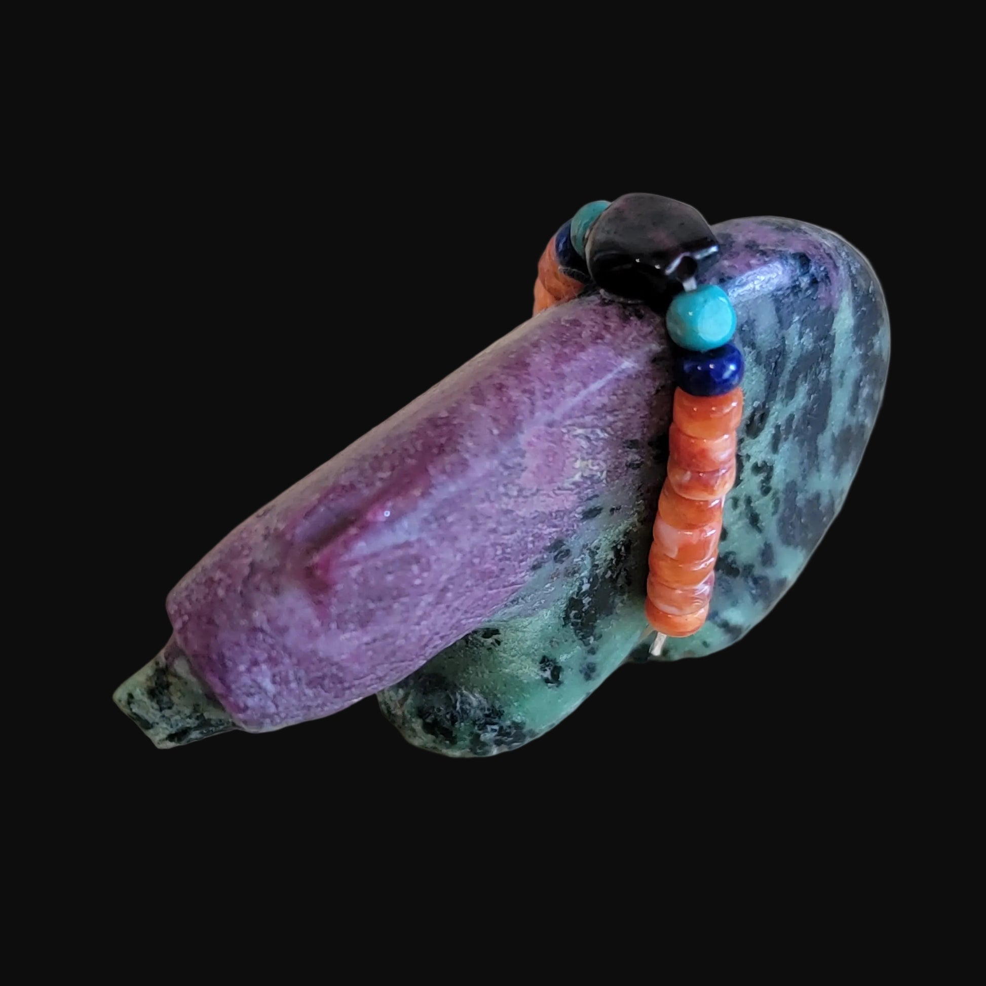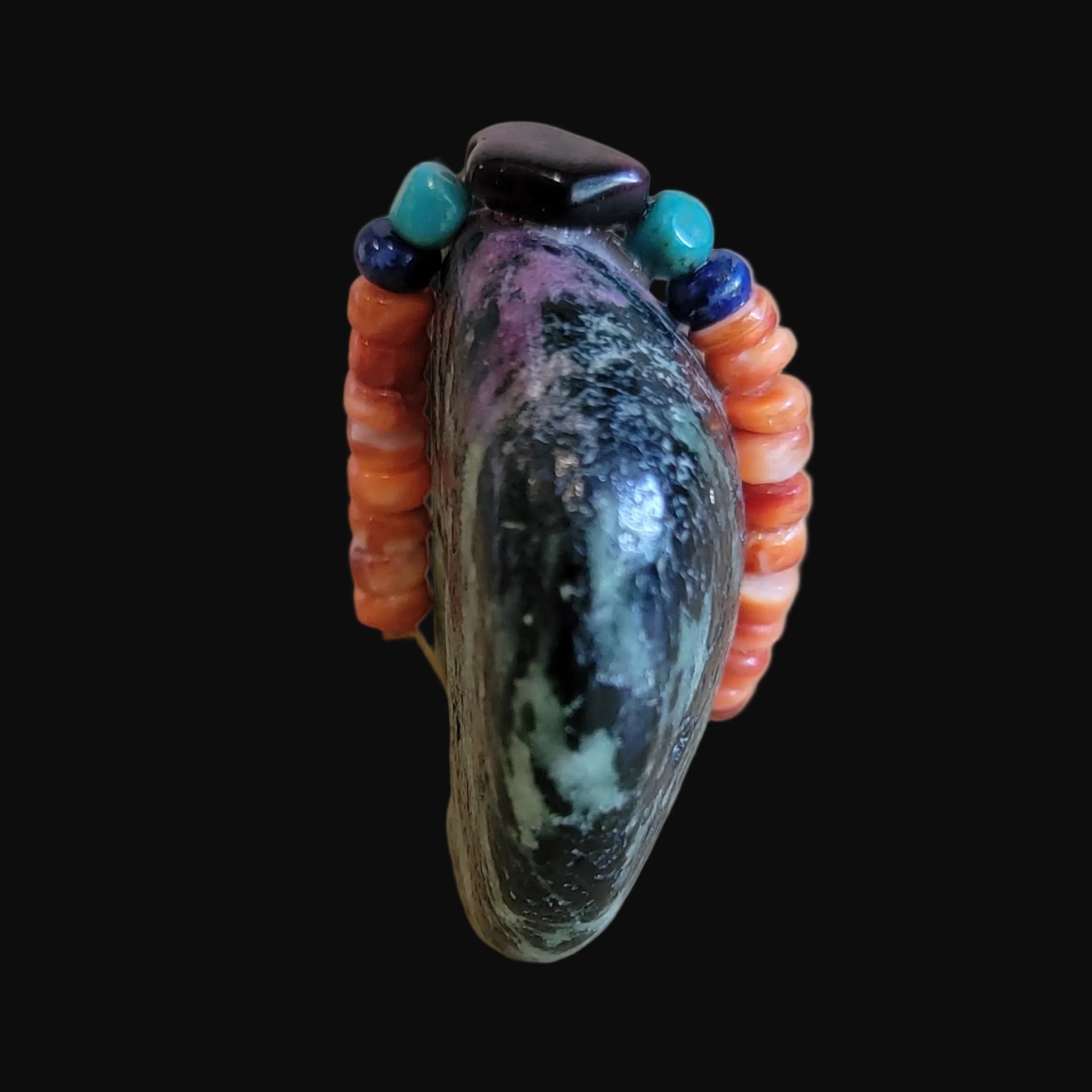 Medium: Unique and beautiful Ruby in Zoesite stone with purple sugalite eyes/ colorful bundle with orange spiny oyster shell, lapis slabs, turquoise beads and large amethyst stone
