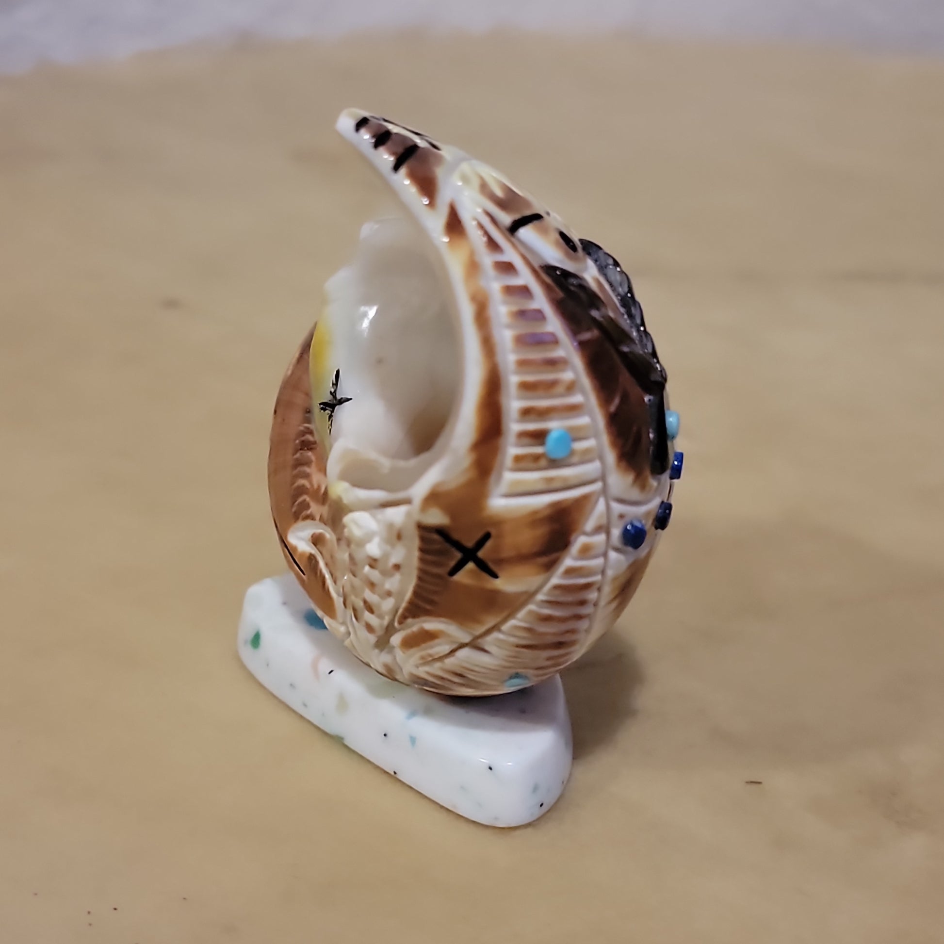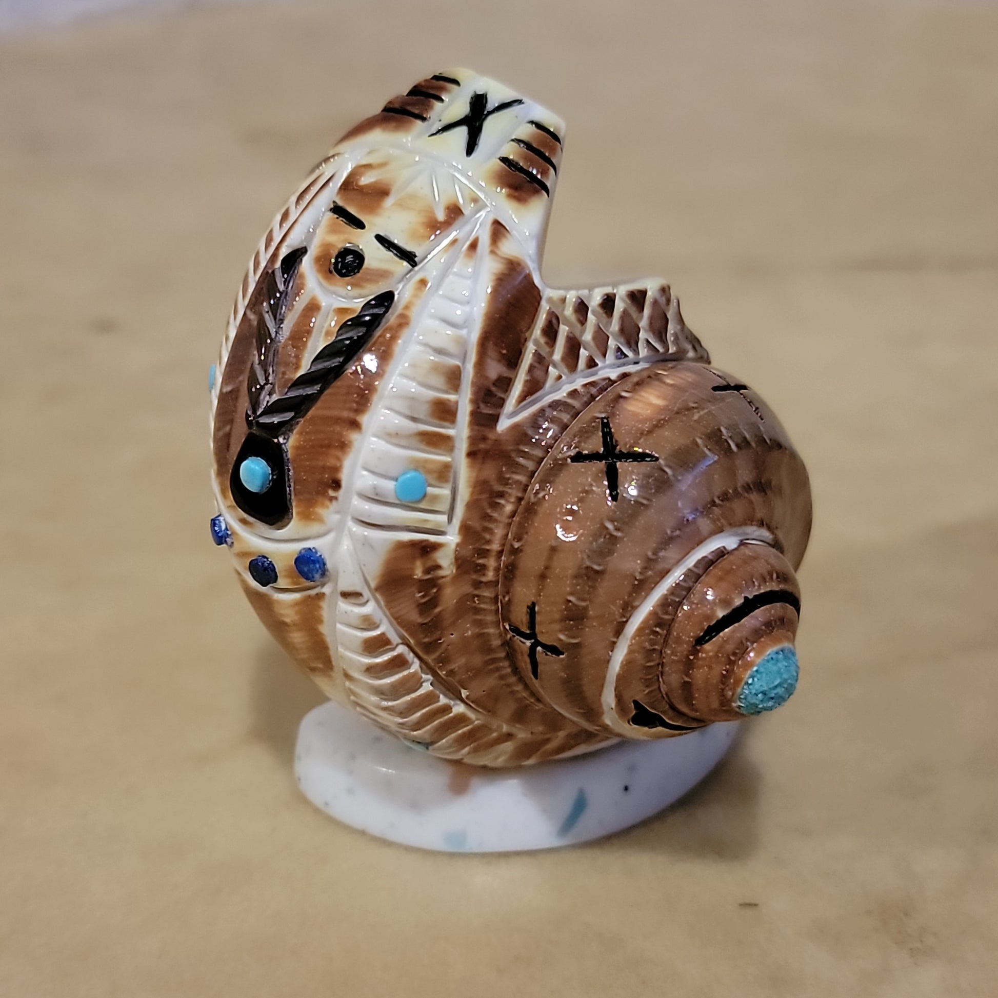 Medium: Natural Snail Shell Maiden with inlaid jet eyes and mouth and appointments/ Pinshell necklace with turquoise center stone/ etched dragonflies and traditional patterns on turquoise adorned shawl/lapis stones at waist/ Chip Turquoise on shell tip/ Bowlerite base