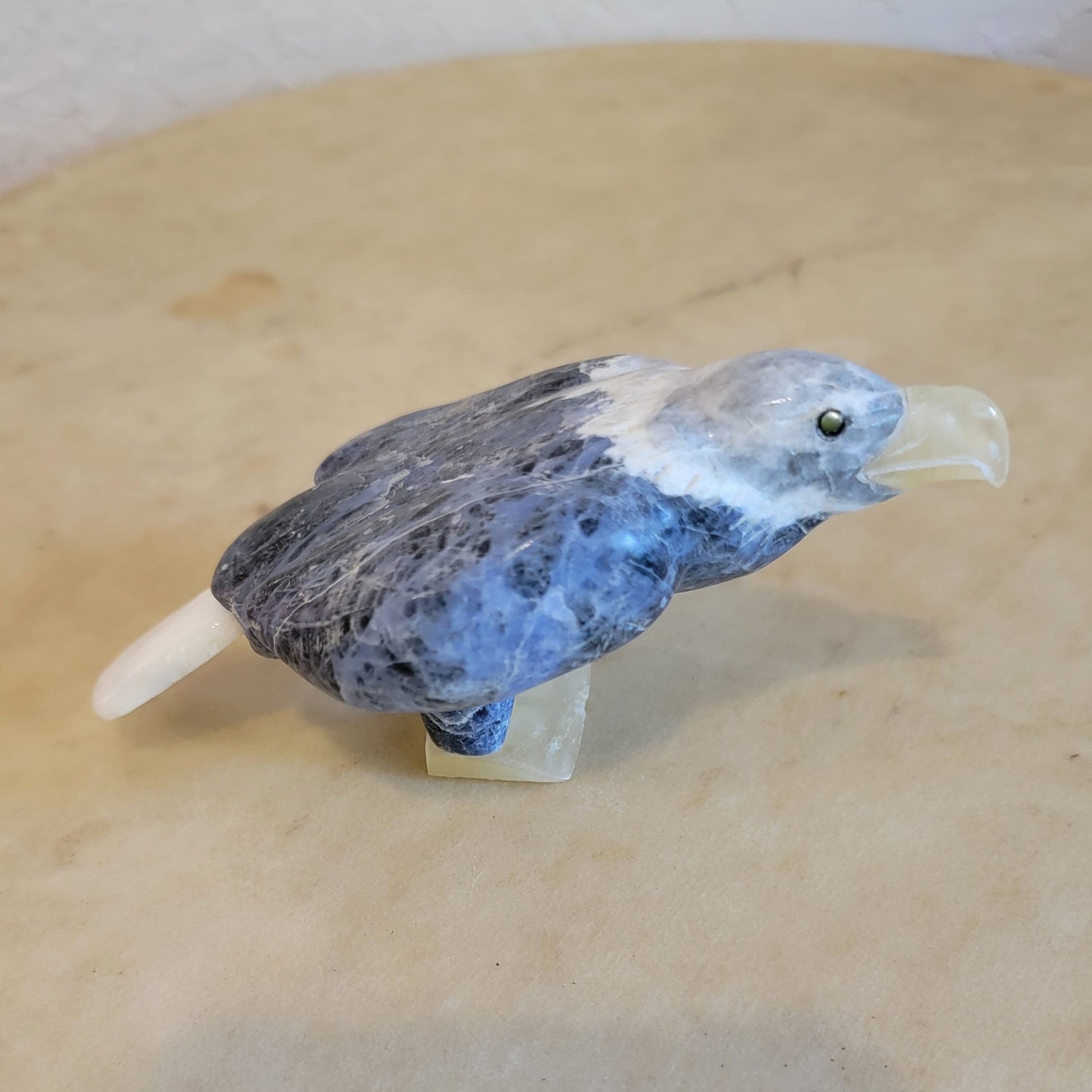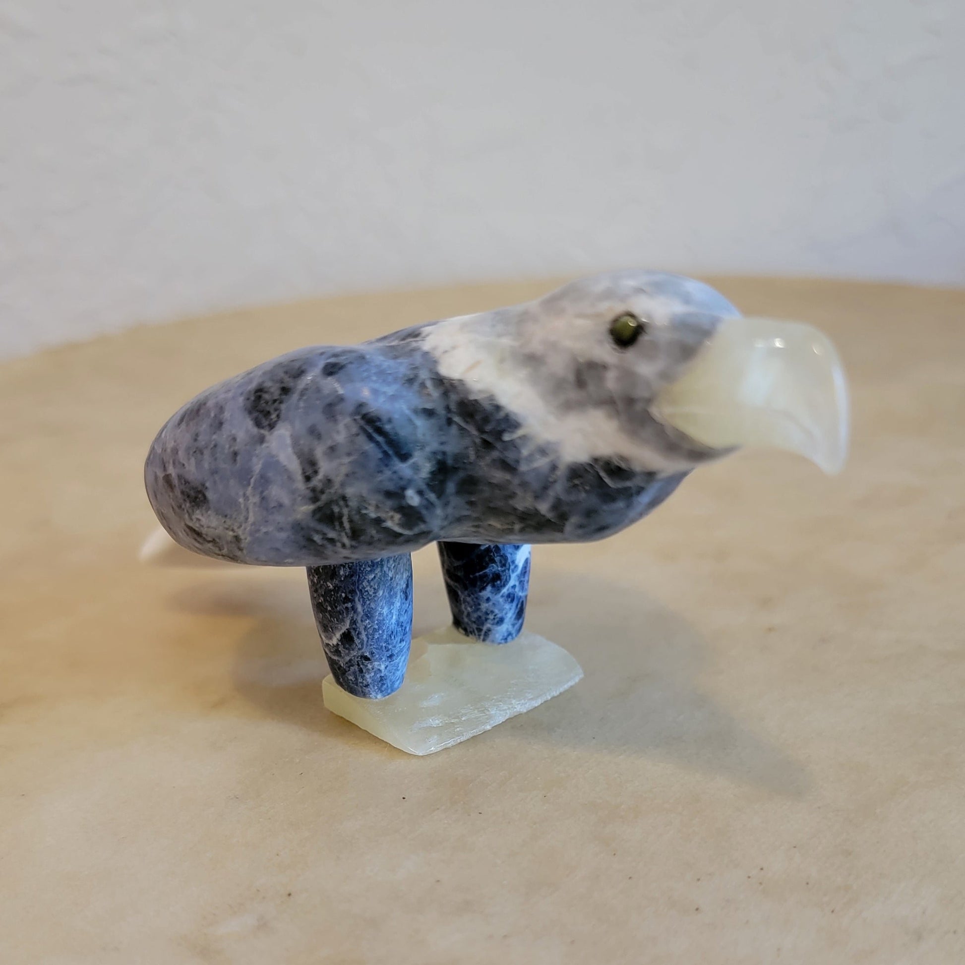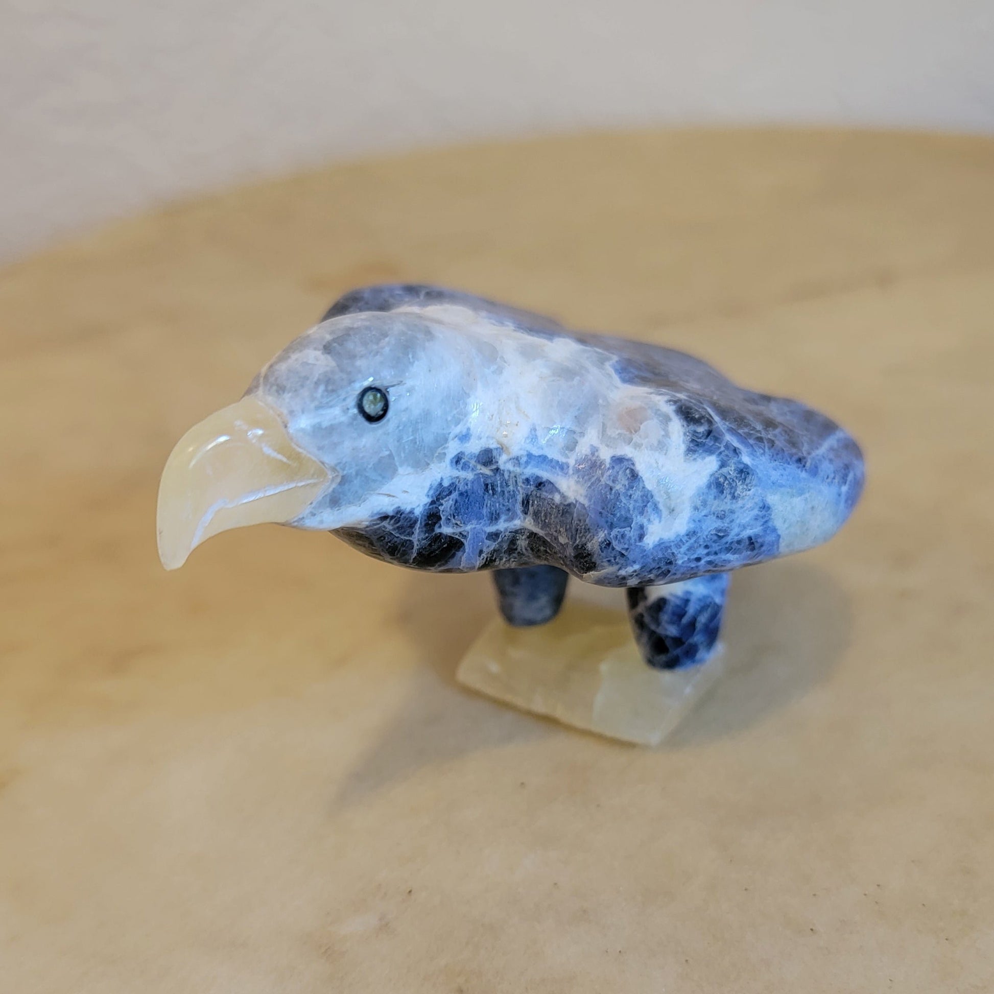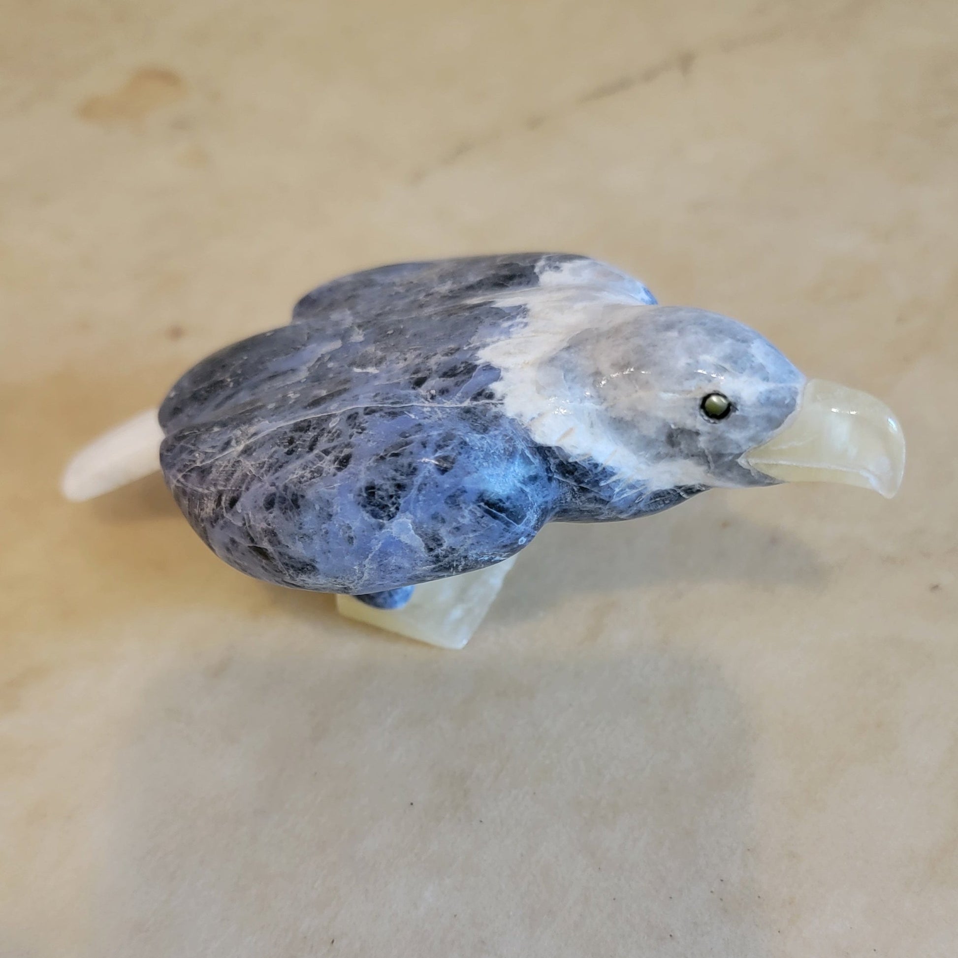 Medium: Sodalite with Jet and Hematite eyes/ Alabaster beak and base/ white marble tail