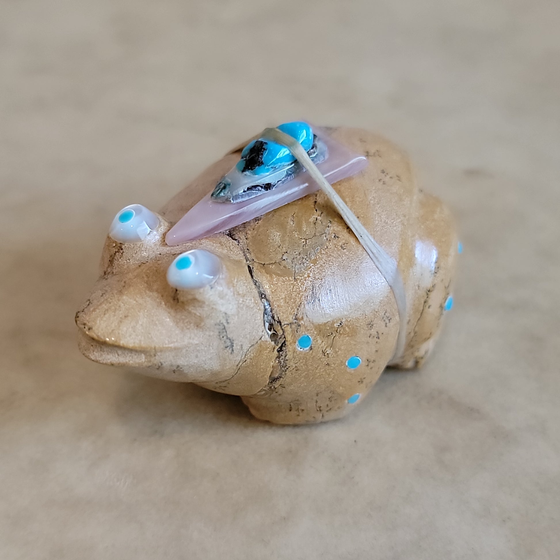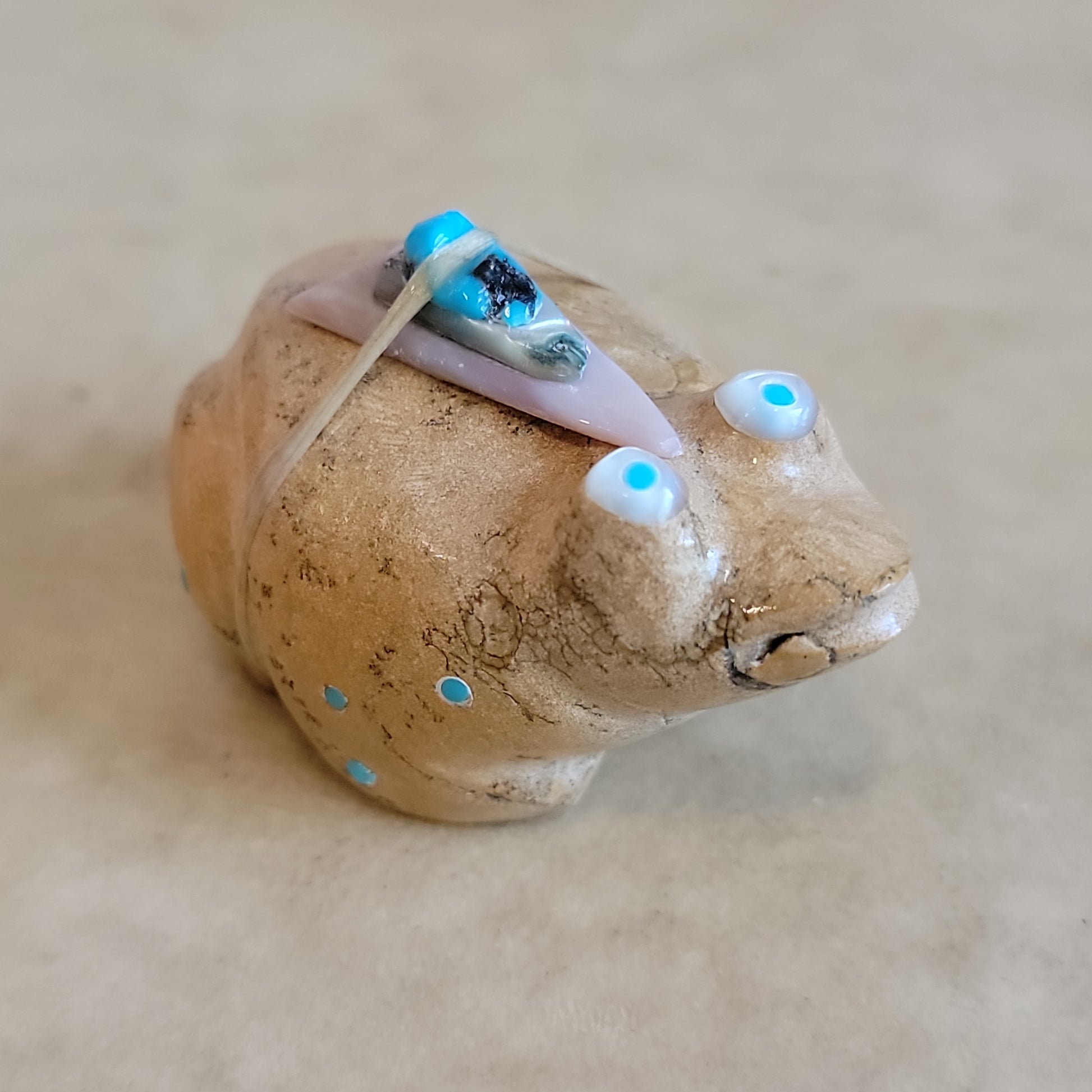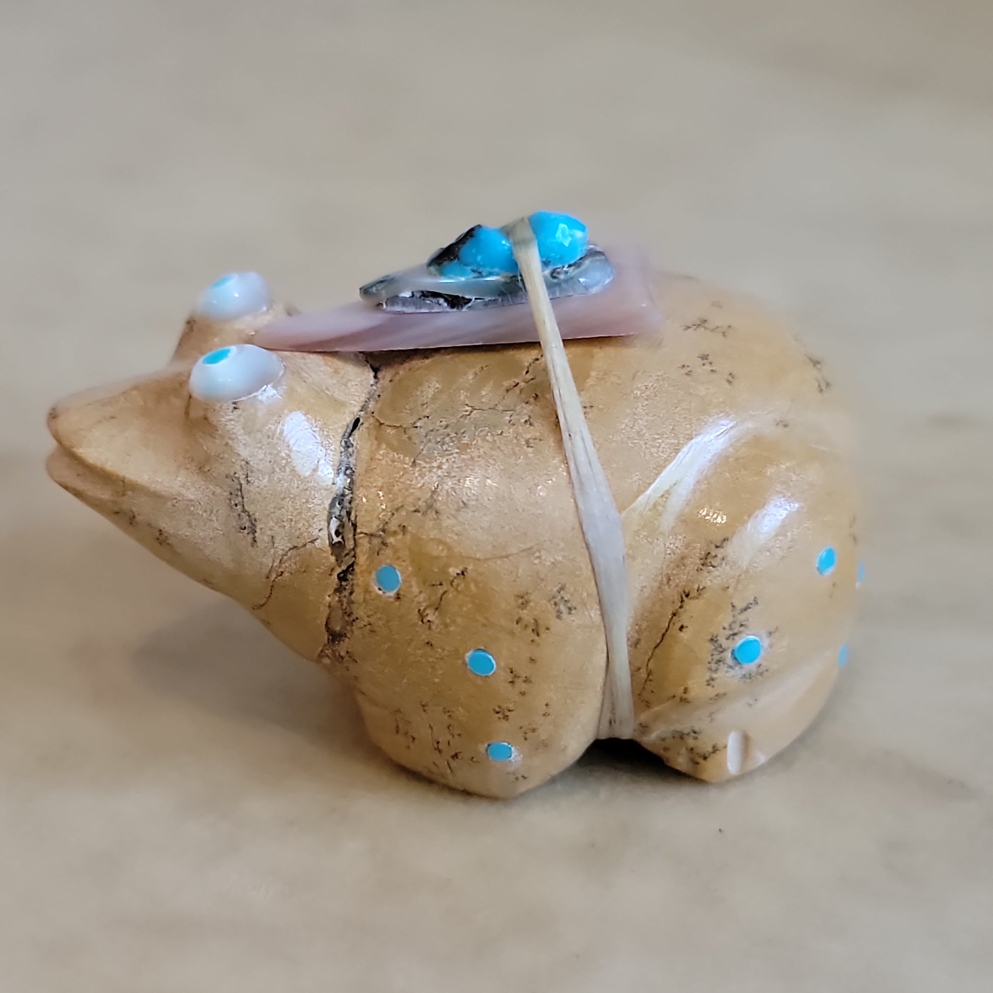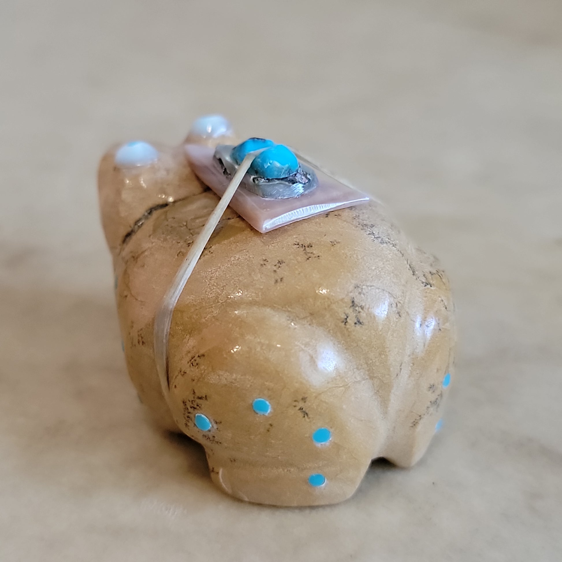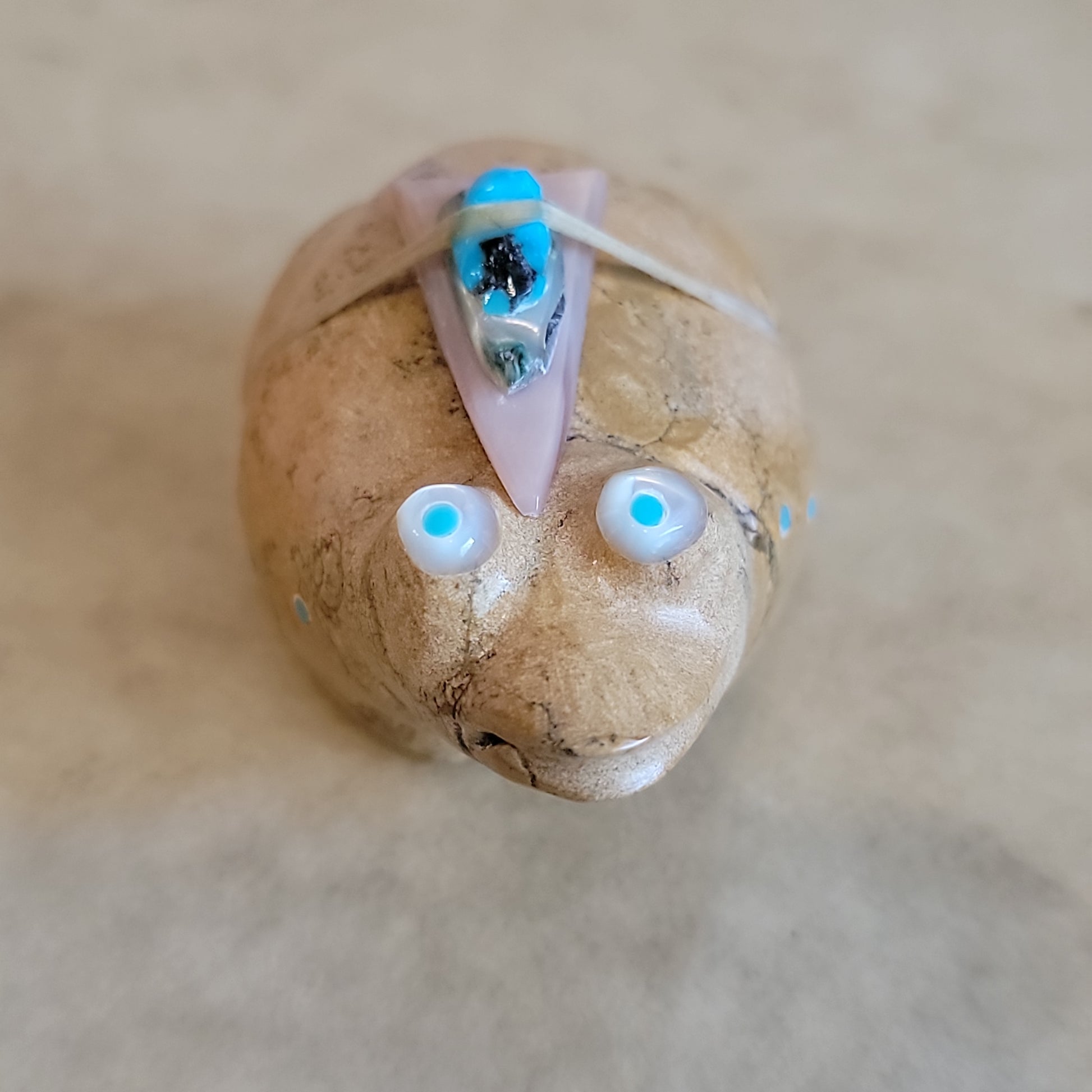 Medium: travertine (Zuni Stone) with BIG Mother of pearl and turquoise eyes/ turquoise appointments/ large pink mussel shell arrowhead with snail shell and turquoise pack
