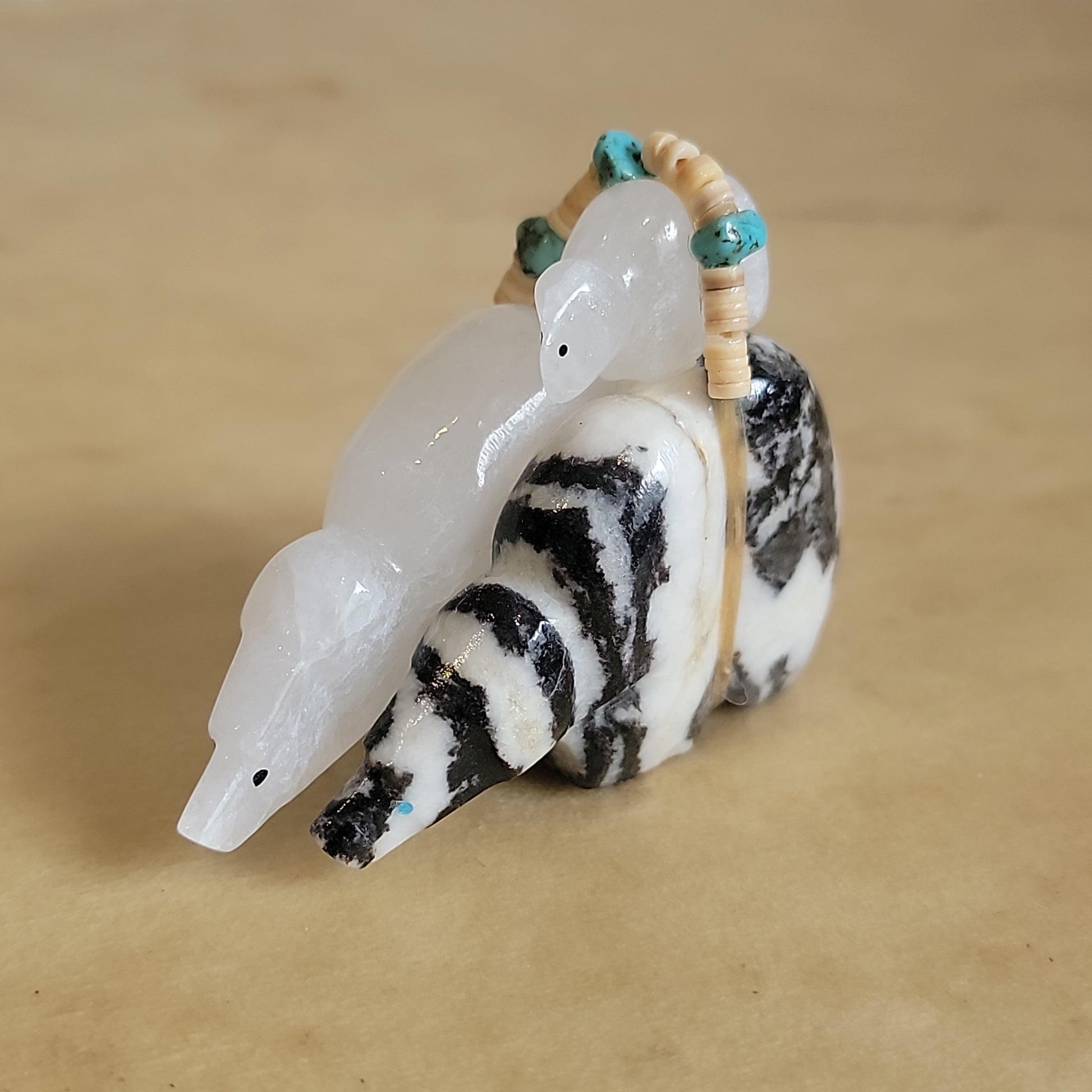 Medium: White alabaster and Zebra stone/ turquoise and jet eyes/ bundled with shell heishe and turquoise nuggets