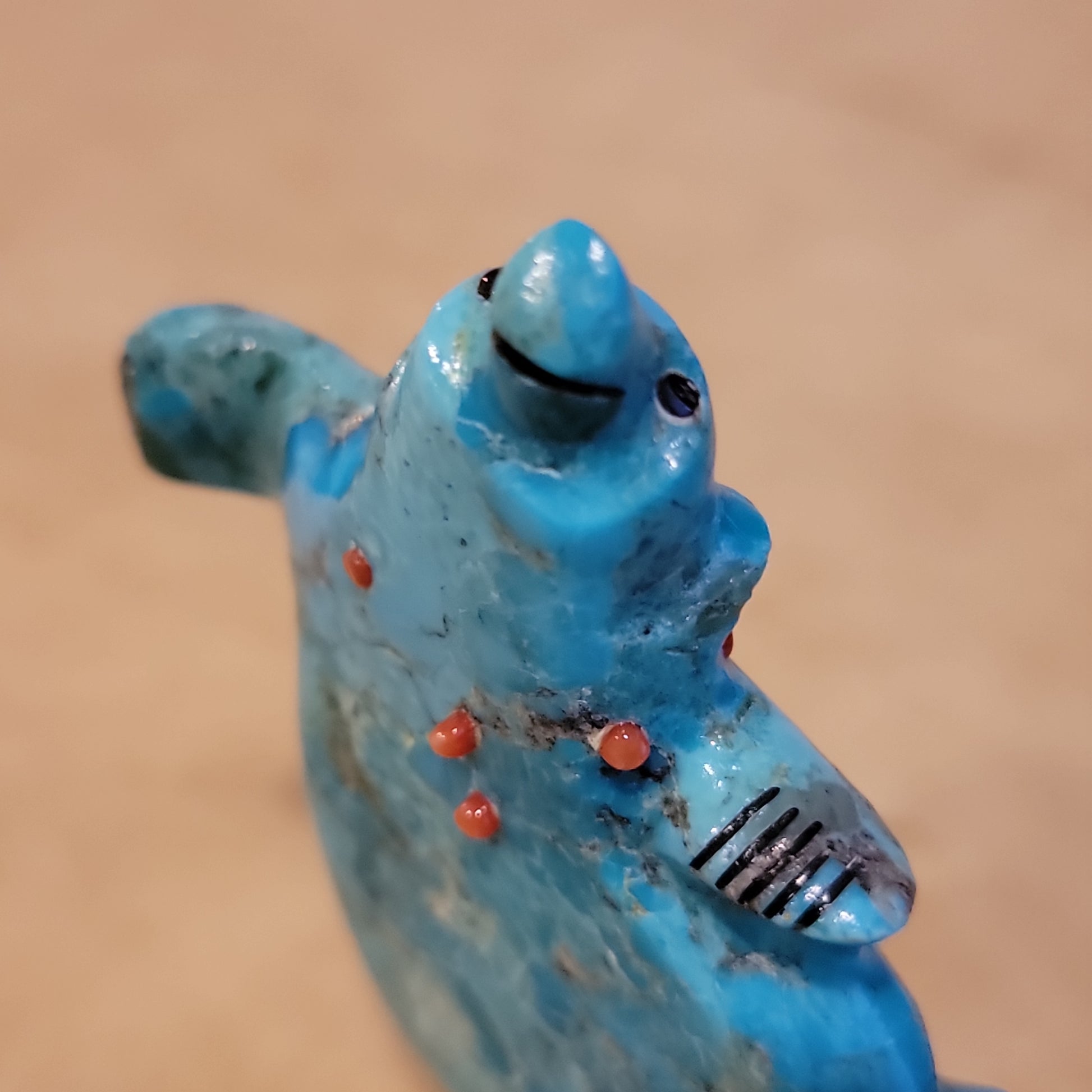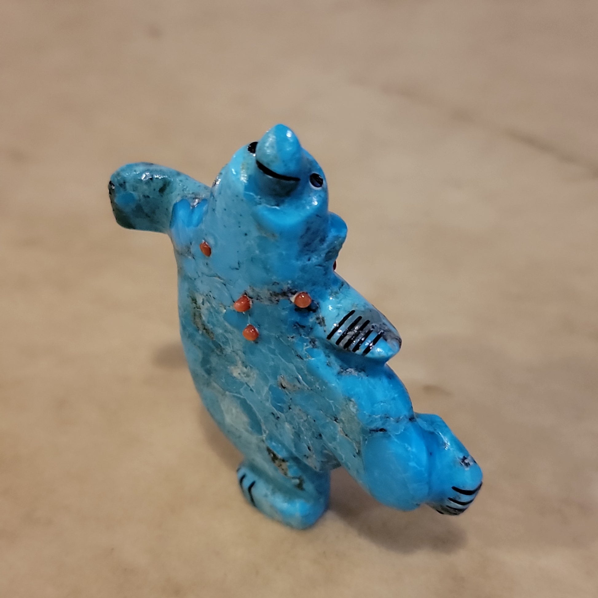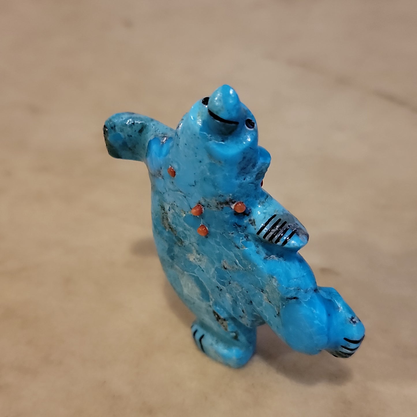 Medium: Colorful turquoise/ Jet mouth, eyes and paws/ turquoise and deep red coral necklace.