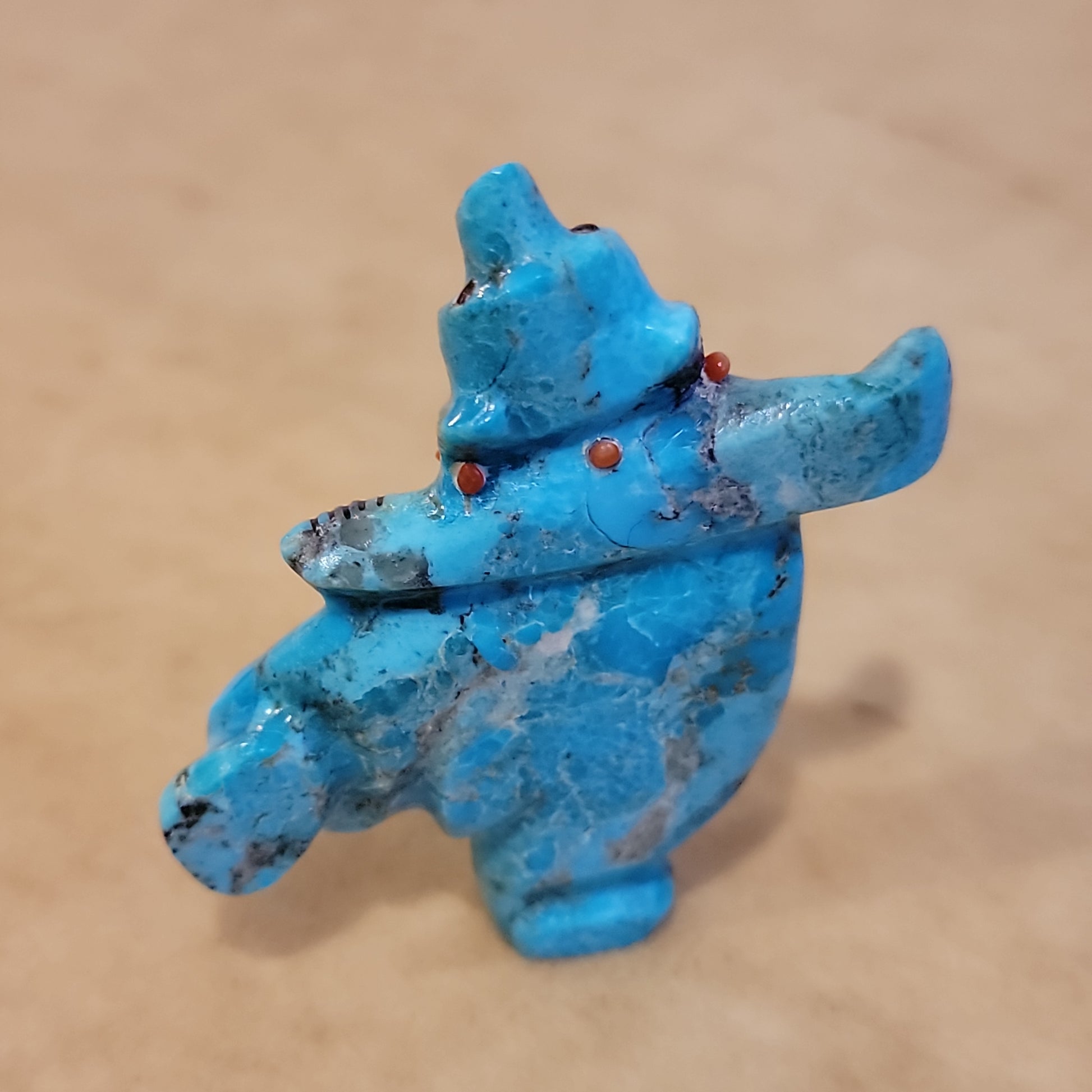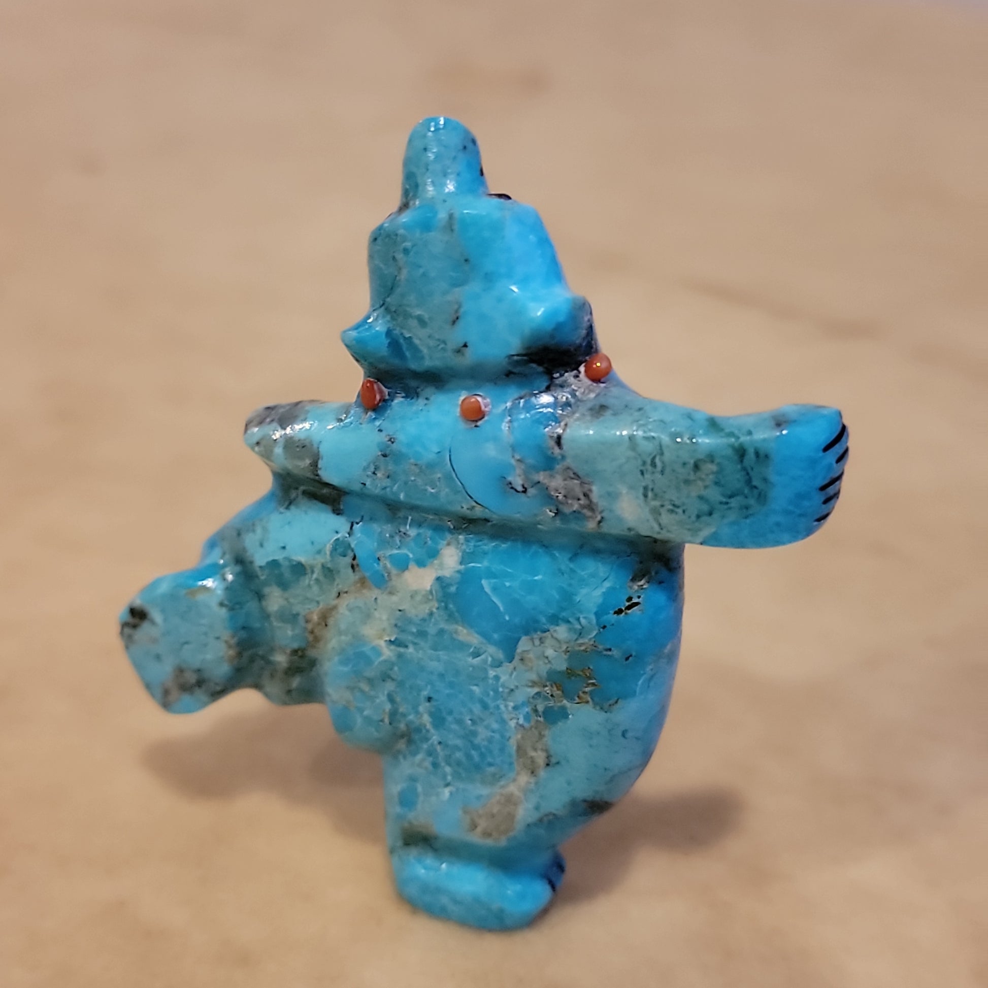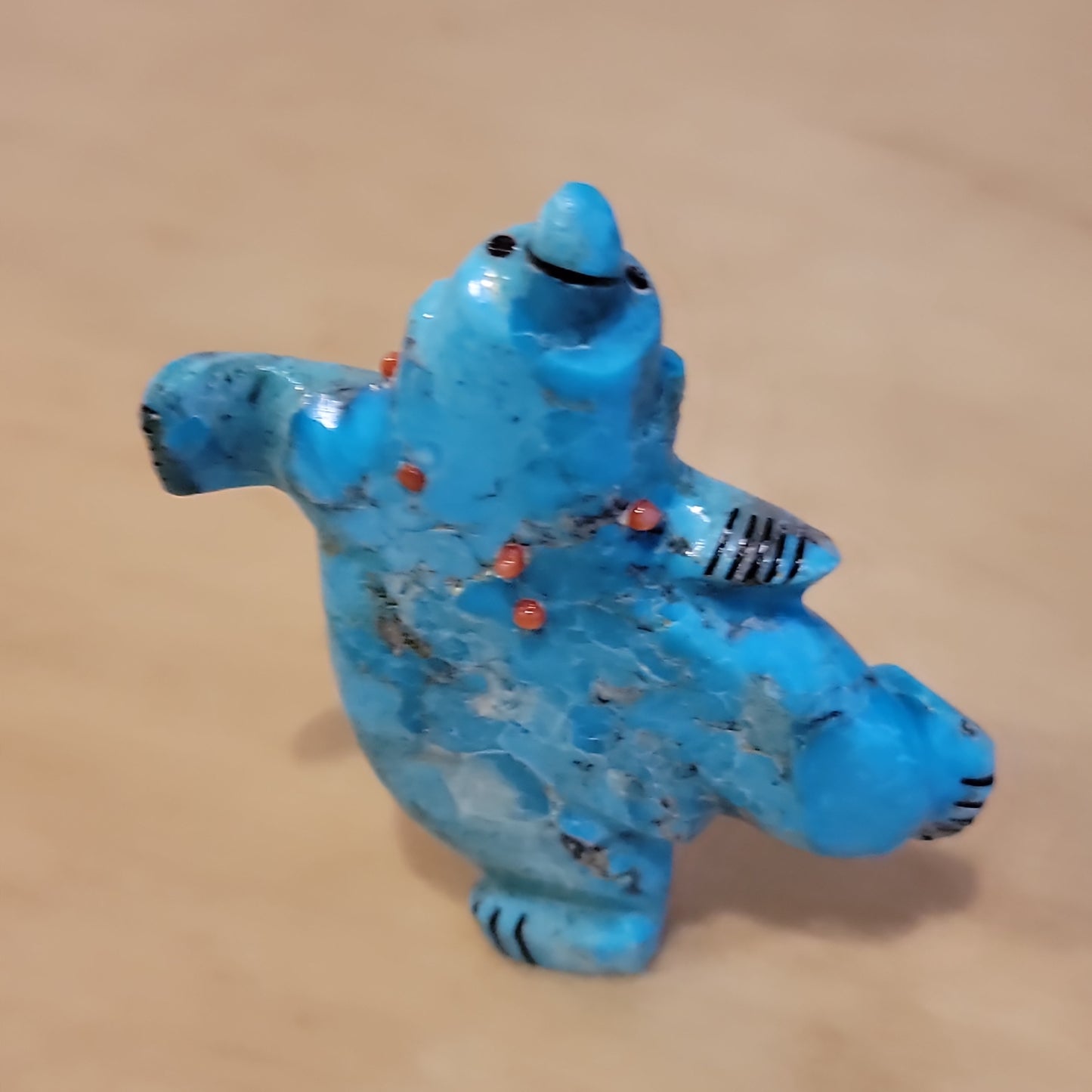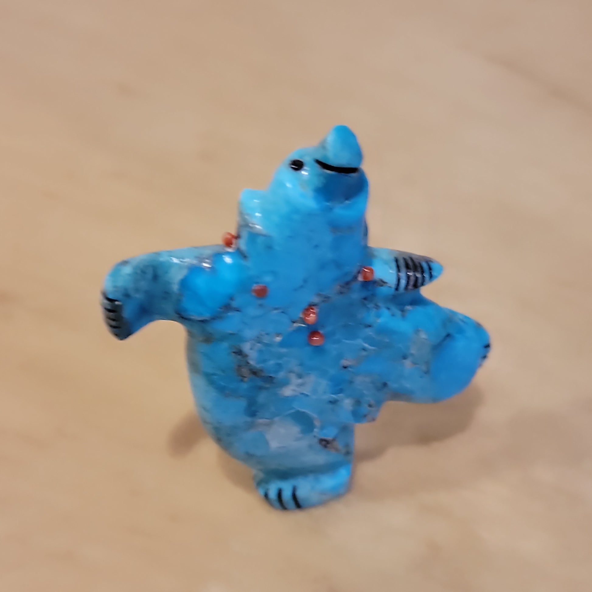 Medium: Colorful turquoise/ Jet mouth, eyes and paws/ turquoise and deep red coral necklace.