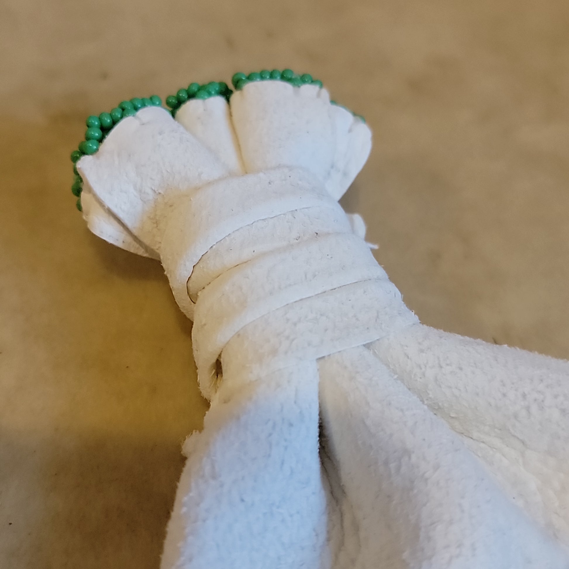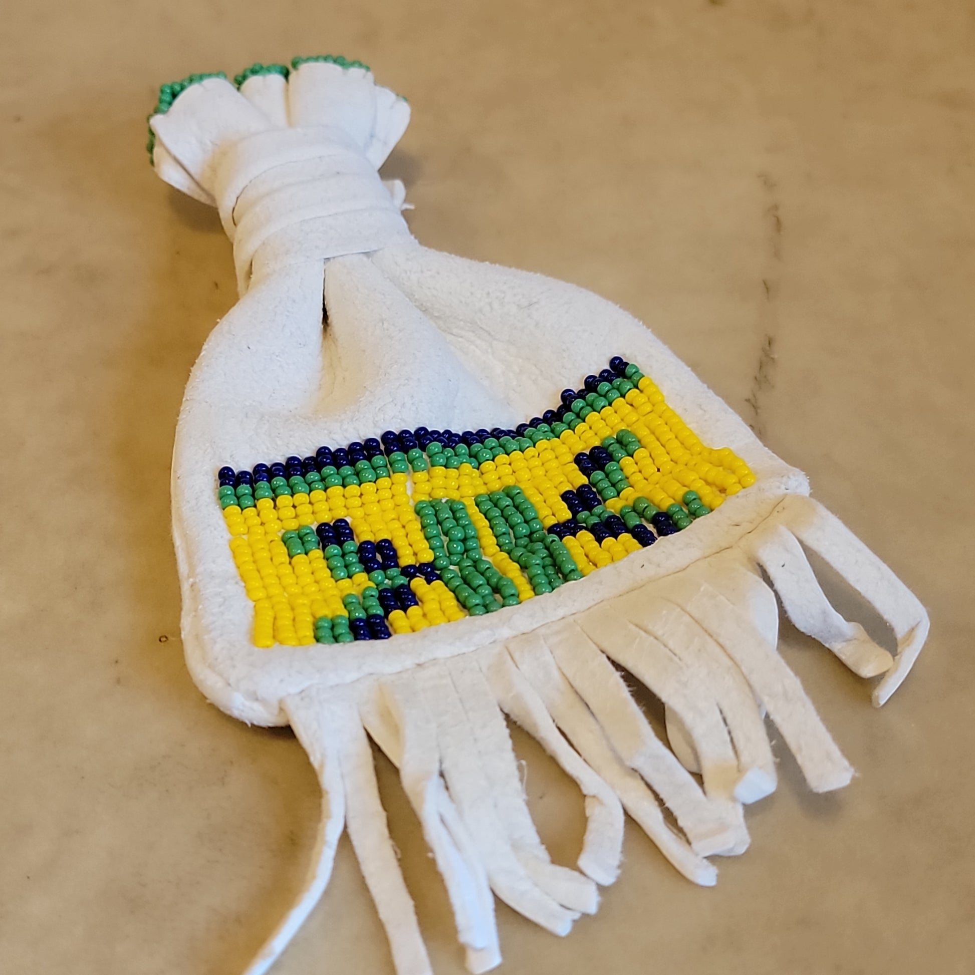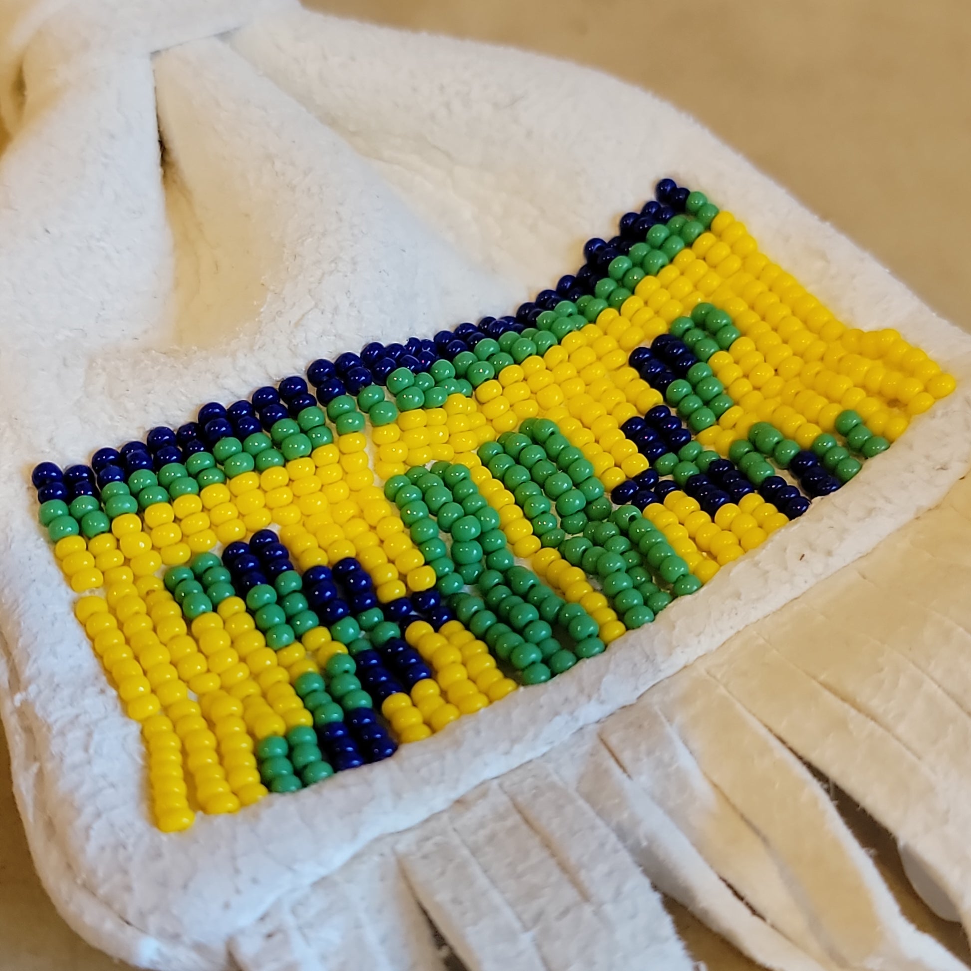 Medium: Buckskin with size #11 glass Czechoslovakian seed beads with a traditional geometric rain pattern