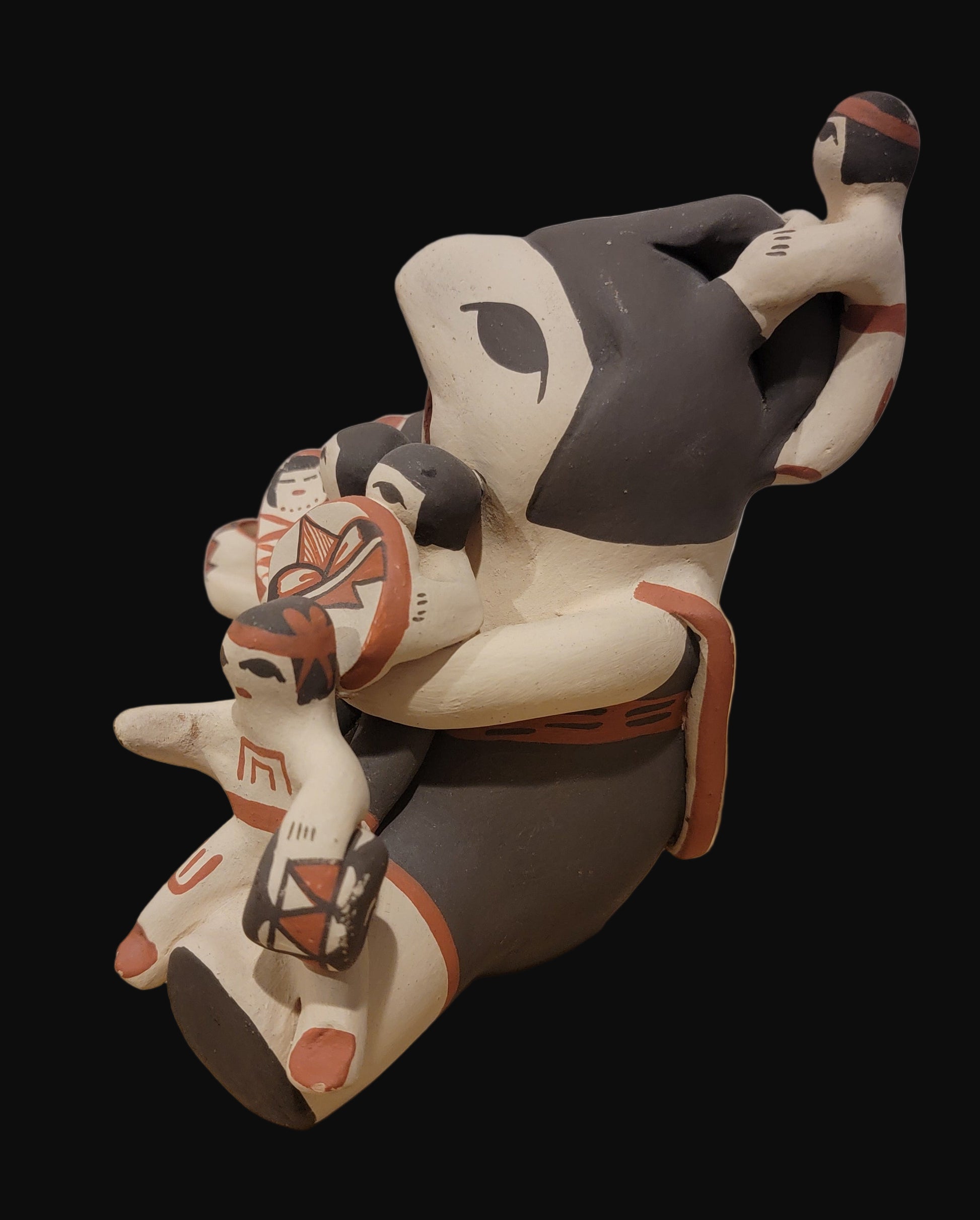 Beautiful Maiden with traditional garb has her hands full! Babies with bowl and drum on her knees/ Baby with Papoose in her lap and baby with vase and one with plate on her sides, while two climb up her back and hair! All the while, this patient Elder passes down the tradition and tales of her culture.